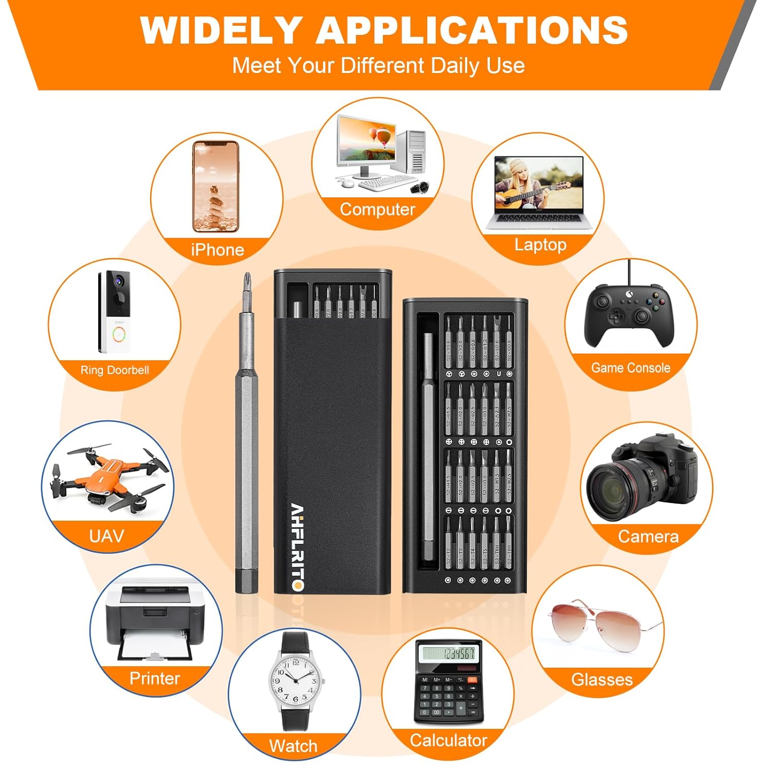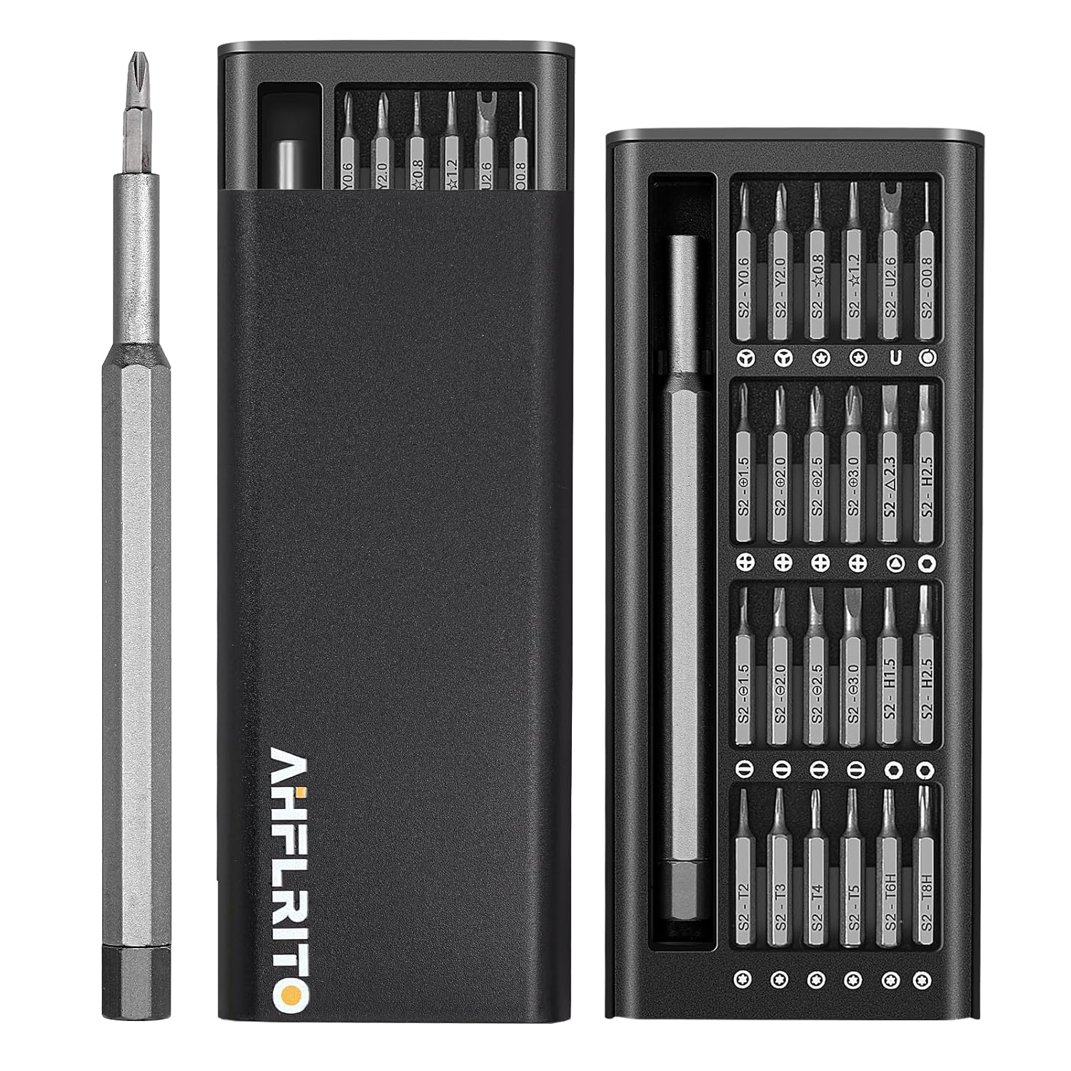 【25 in 1 Precision Screwdriver Kit】 AHFLRITO professional precision screwdriver set is the most complete screwdriver set, including all the necessary screw heads for your daily repairs: torx (T2, T3, T4, T5, T6, T7, T8), phillips head (1.5, 2.0, 2.5, 3.0), flat heads (1.5, 2.0, 2.5, 3.0), hex (H1.5, H2.0, H2.5), Y (0.6, 2.0), star (0.8, 1.2), slotted, triangle head, U-Sharp, etc.