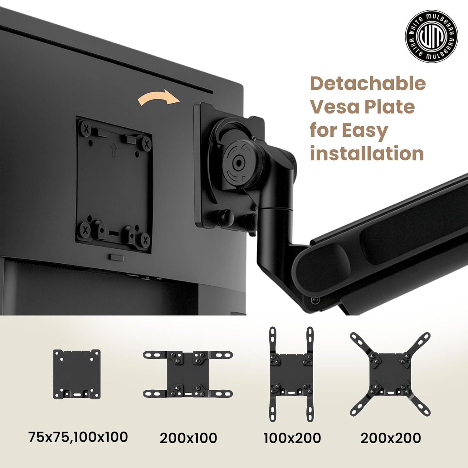 Quick-Release VESA Plate – Compatible with 75×75, 100×100, 100×200, 200×100, and 200×200 mm mounting patterns; easy, tool-free screen installation and replacement.
