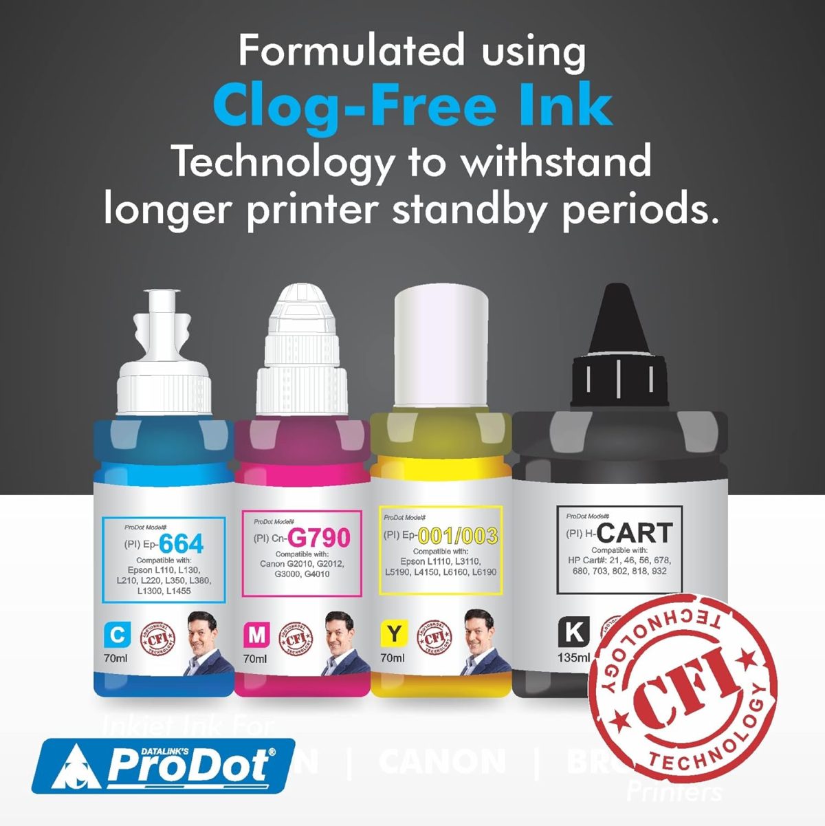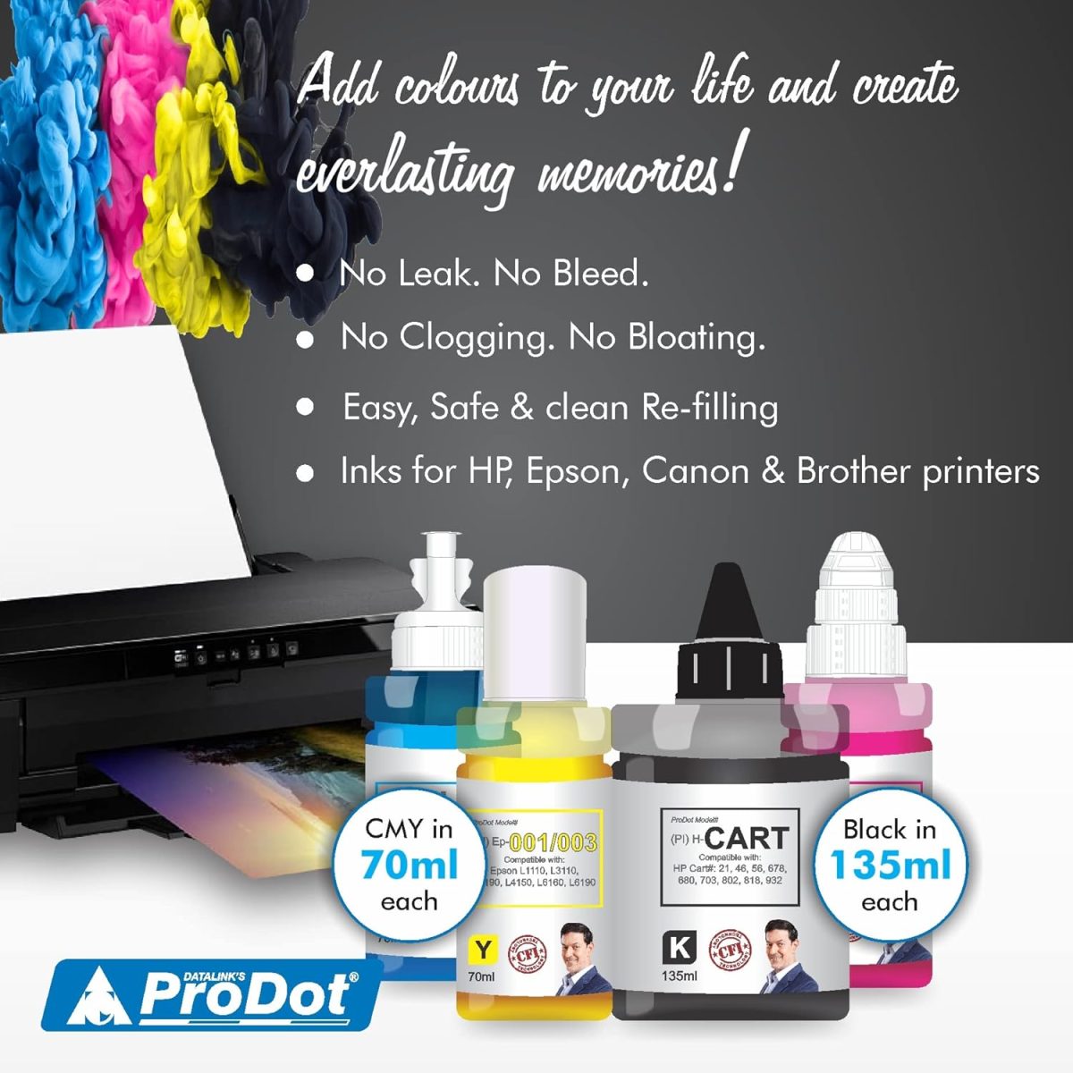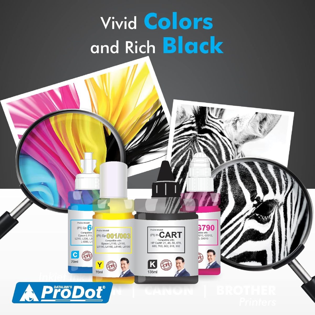 ProDot Refill Ink: Delivers accurate printouts in terms of darkness, sharpness and color. Deionized Water and Salt free Dyes ensures vibrant colors and zero damage to print head. Multilevel filtration to control the particle size<1 micron and No leak, No Bleed.