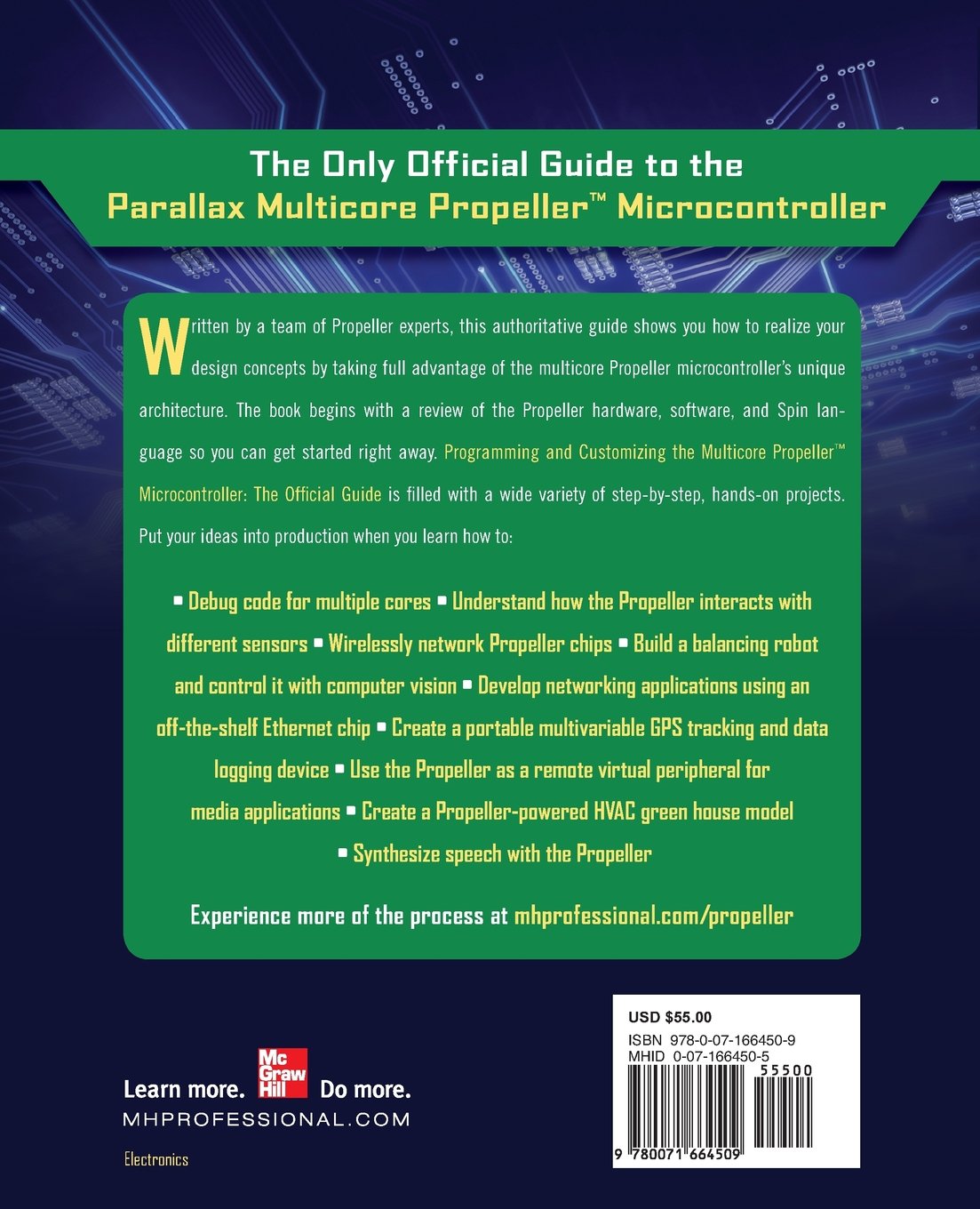 Debug code for multiple coresUnderstand how the Propeller interacts with different sensorsWirelessly network Propeller chipsBuild a balancing robot and control it with computer visionDevelop networking applications using an off-the-shelf Ethernet chipCreate a portable multivariable GPS tracking and data logging deviceUse the Propeller as a remote virtual peripheral for media applicationsCreate a Propeller-powered HVAC green house model Synthesize speech with the Propeller