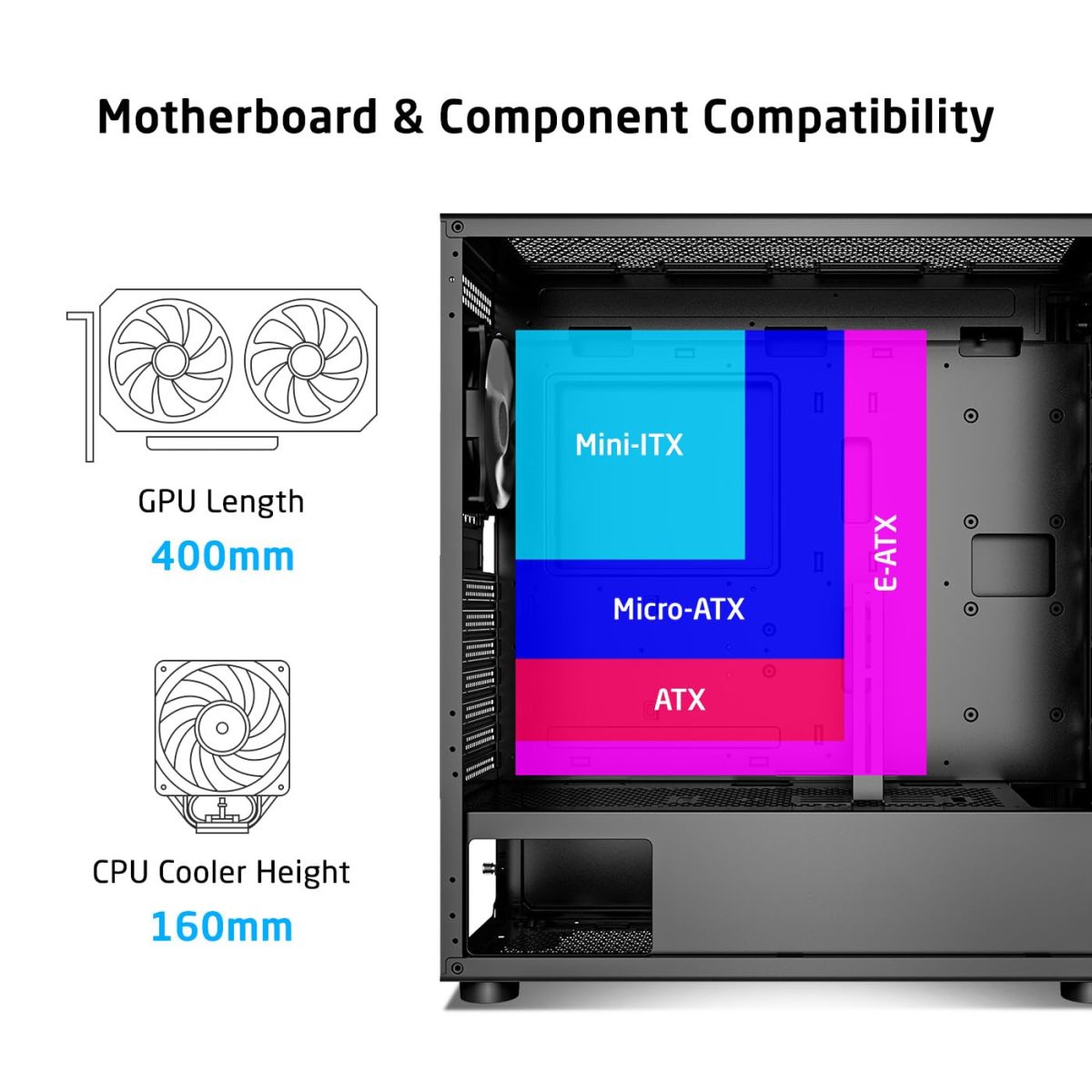 🔌Class-leading Component Compatibility : Choose components as you please, with E-ATX Motherboards, 400m Length of GPUs, 165mm of CPU Cooler Height. Also, enough space to add up to 3*3.5″ HDDs or 2*2.5” SSDs