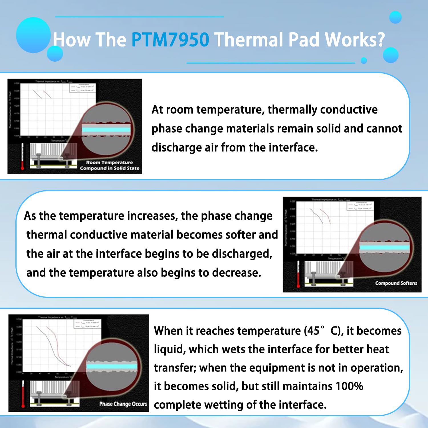 When the phase change thermal conductive material reaches the phase change temperature(45°C), it becomes liquid and can greatly wet the interface, discharge the air inside the interface, reduce the interface thermal resistance, and transfer heat as much as possible; When the device is in a non working state, the phase change thermal conductive material becomes solid again, but maintains 100% complete wetting of the interface (Picture 3)