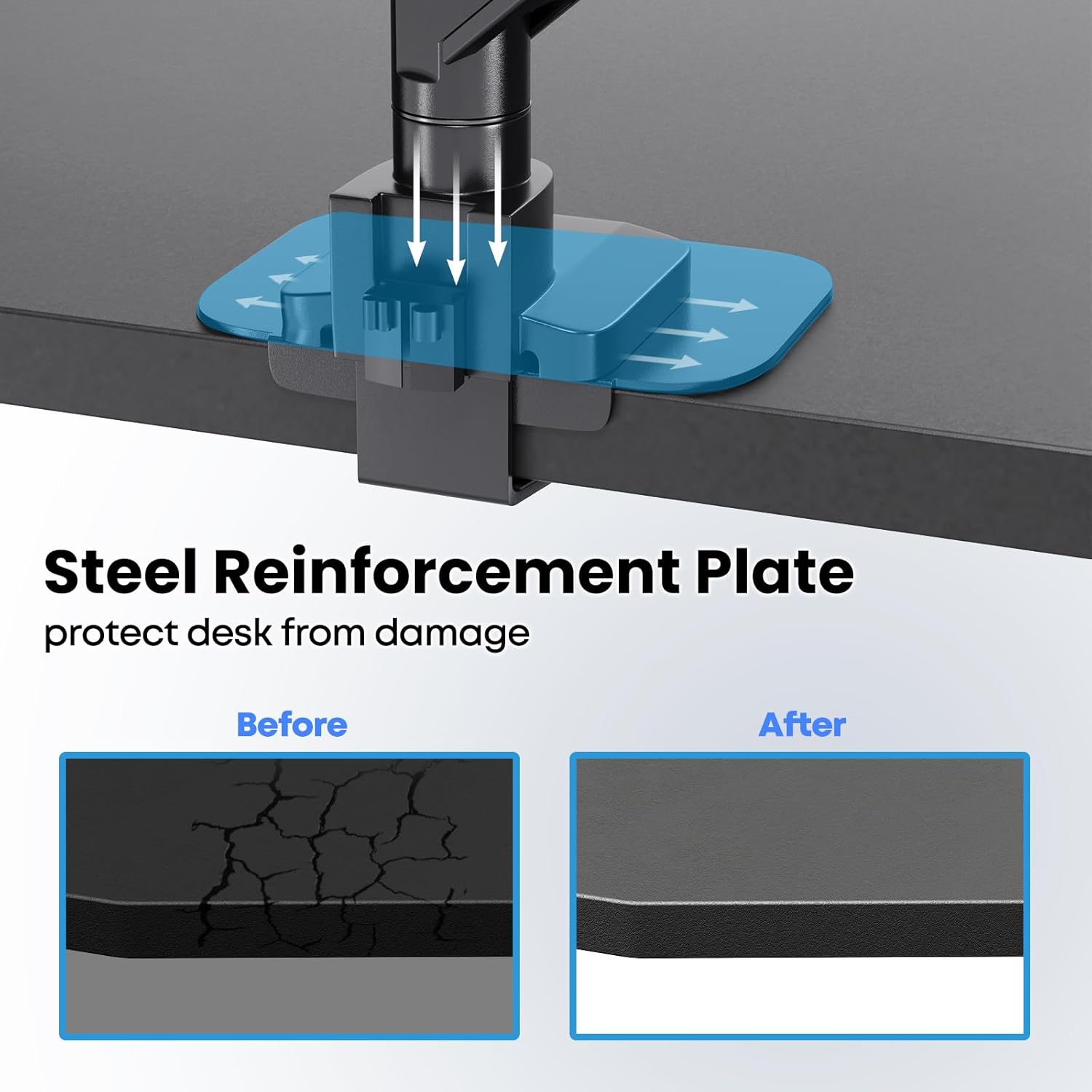 Protect Desk from Damage and Messy:All-steel reinforcement plate kit safely disperse the monitor weight across larger area, prevent distortion of the mounting part and protect your desk from damages and scratches. Included cable clips delivery maximum tidiness, even the Allen key can be tidied away under the cover so that you always have it ready.