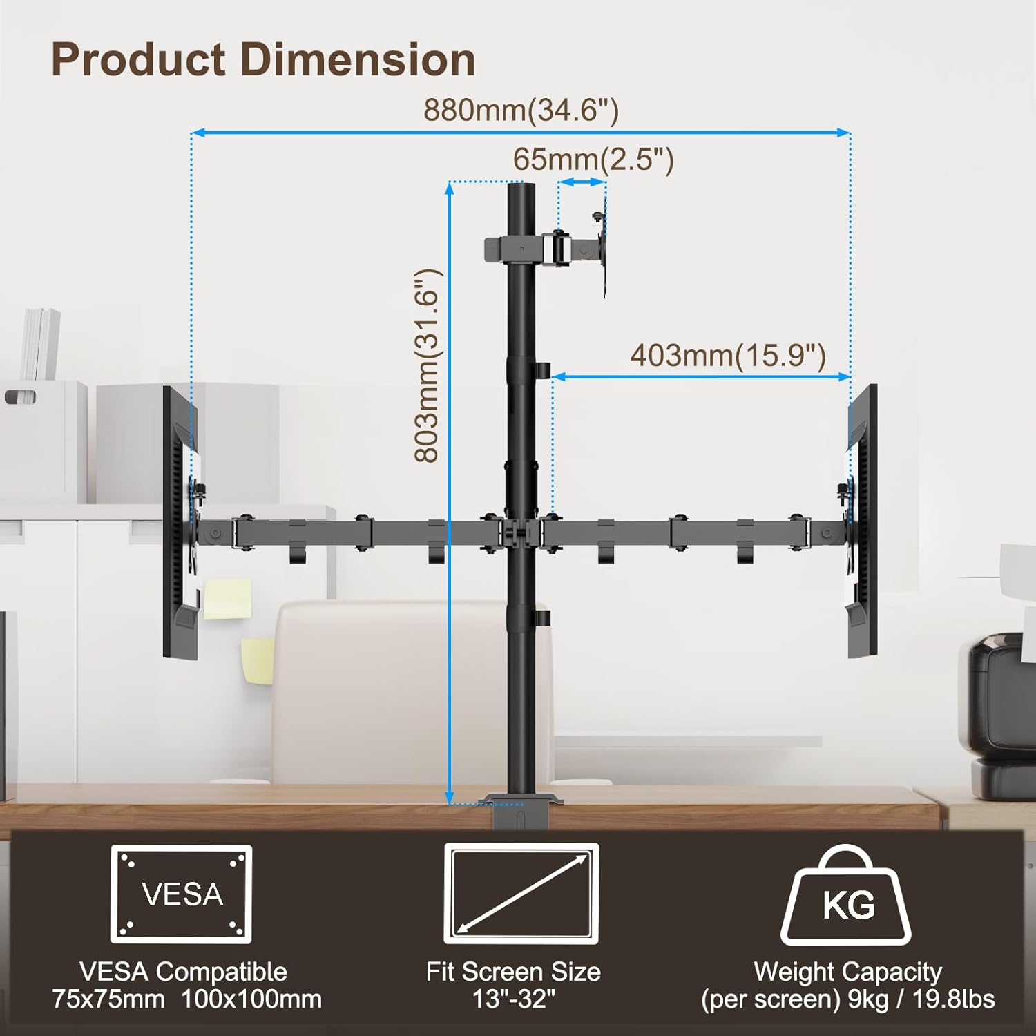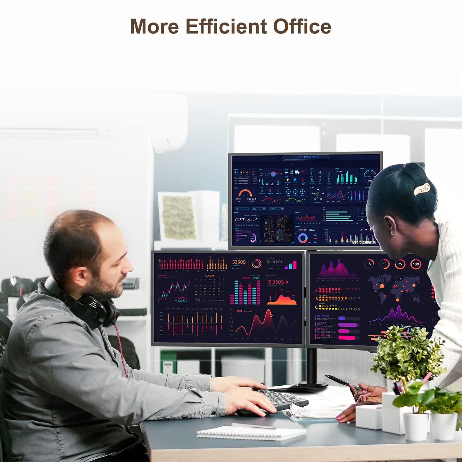 Universal monitor arm: each arm of this 3-arm monitor stand is suitable for screens with VESA 75 x 75 and 100 x 100 mm. Made of high-quality steel, this screen mount is very stable and durable, which is a wonderful choice for productivity.