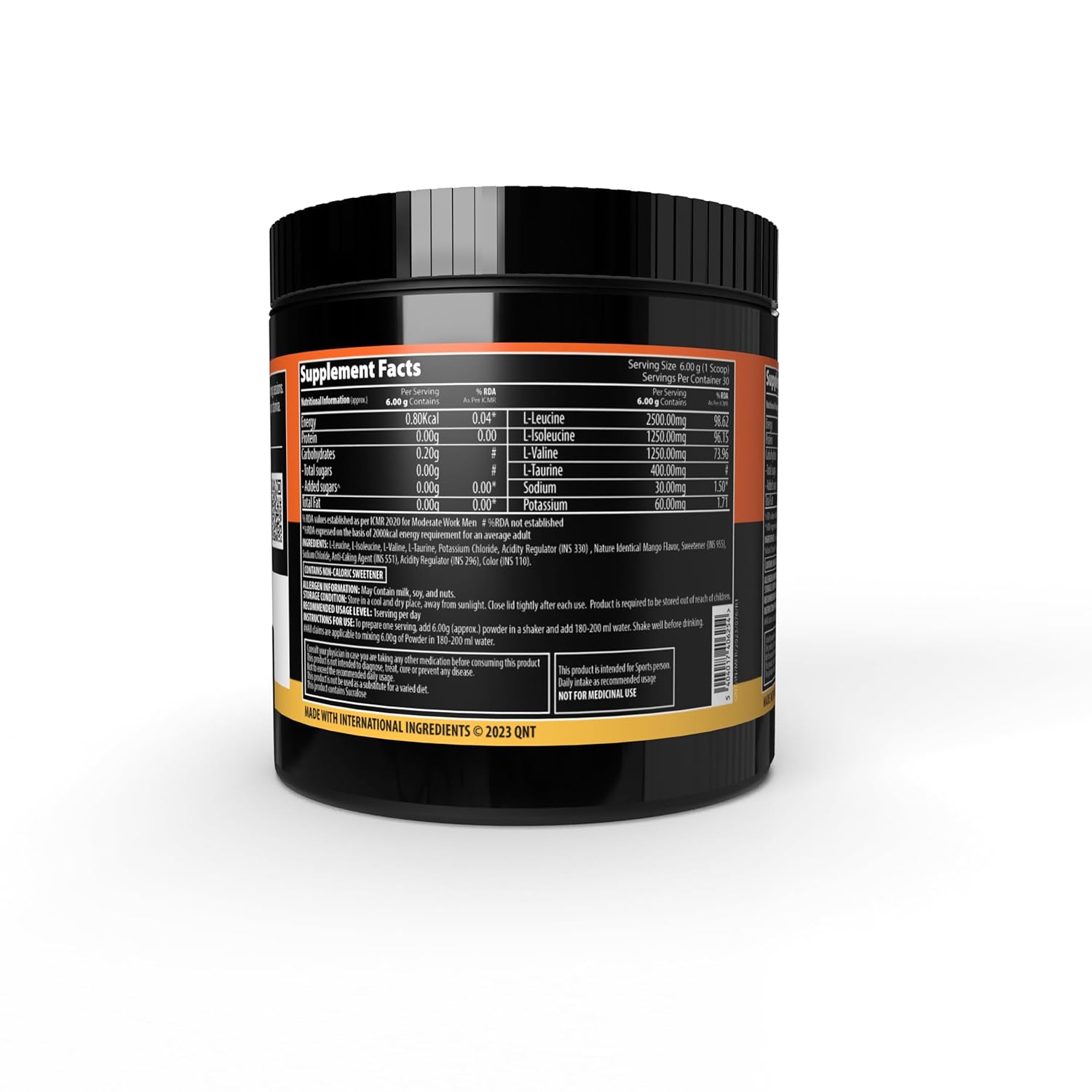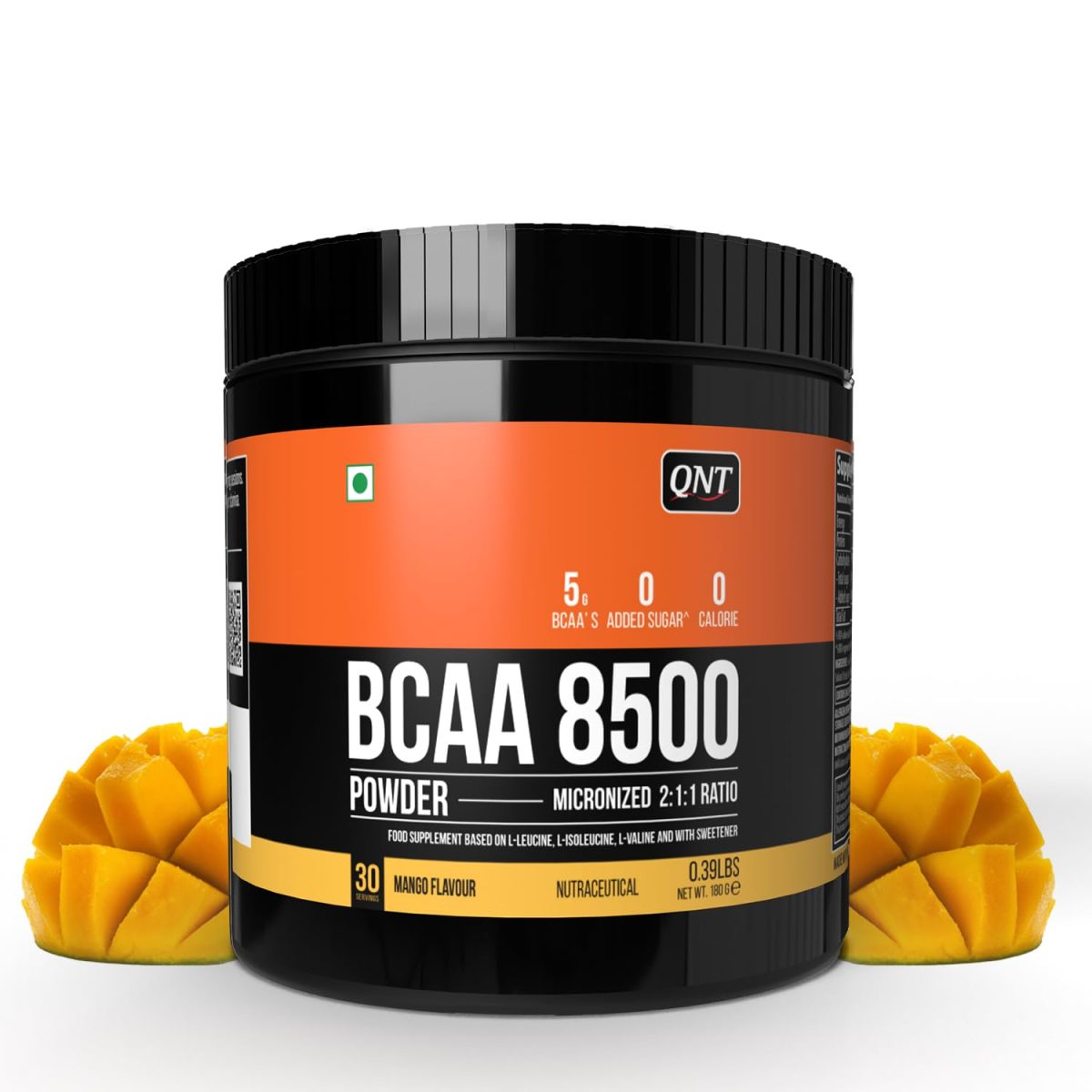 QNT BCAA 8500 | 180g | 30 Servings | Mango Flavour | 2500mg L-Leucine, 1250mg L-Isoleucine, 1250mg L-Valine | Hydration & Muscle Recovery Supplement | Pre/Post Workout for Strength & Stamina
