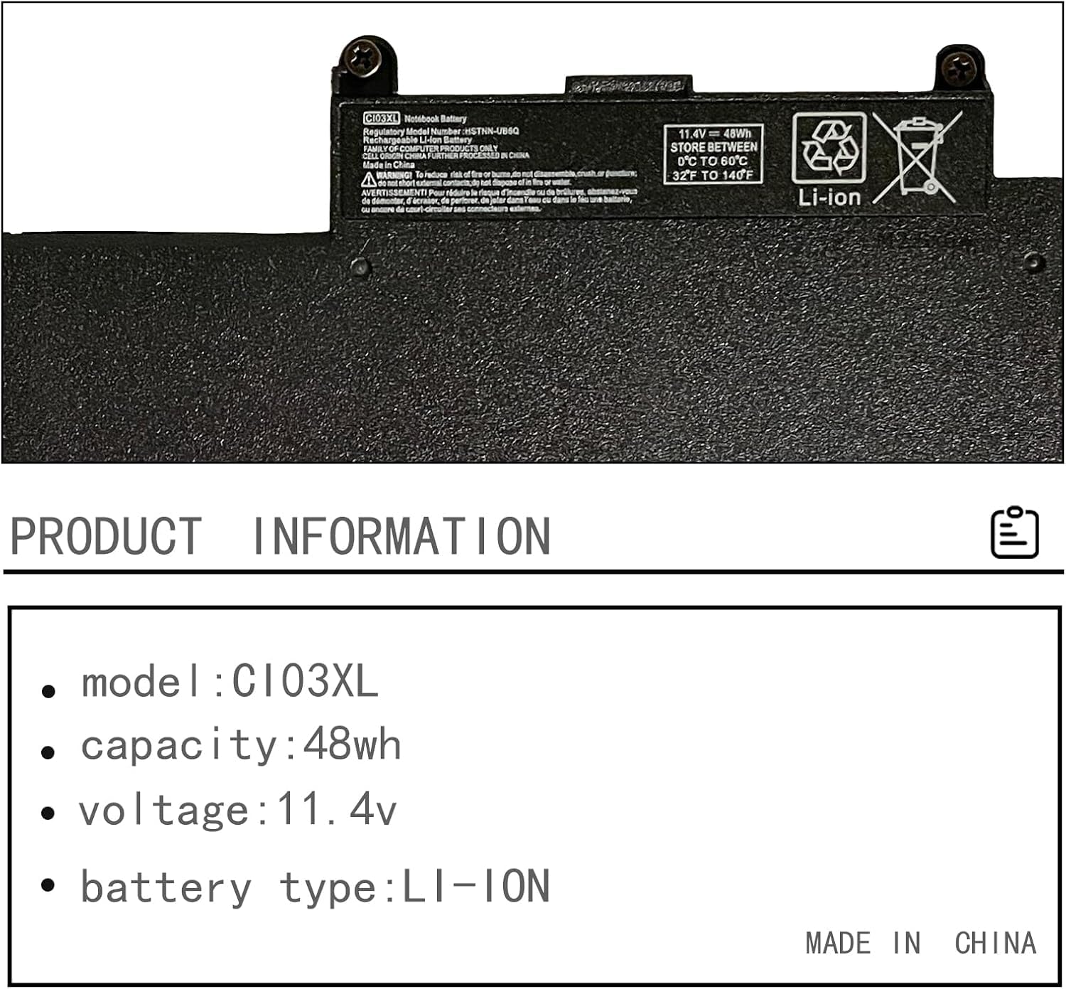 ➤Replace Part Number】801517-221, 801517-222, 801517-231, 801517-232, 801517-241, 801517-242, 801517-421, 801517-541, 801517-831, 801554-001, C103XL, CI03, CI03048XL, CI03XL, CIO3, CIO3XL, HSTNN-DB7N, HSTNN-I66C-4, HSTNN-I66C-5H, HSTNN-I66C-5U, HSTNN-I67C-4, HSTNN-I67C-5, HSTNN-LB6T, HSTNN-PB6K, HSTNN-UB6Q, T7B31AA