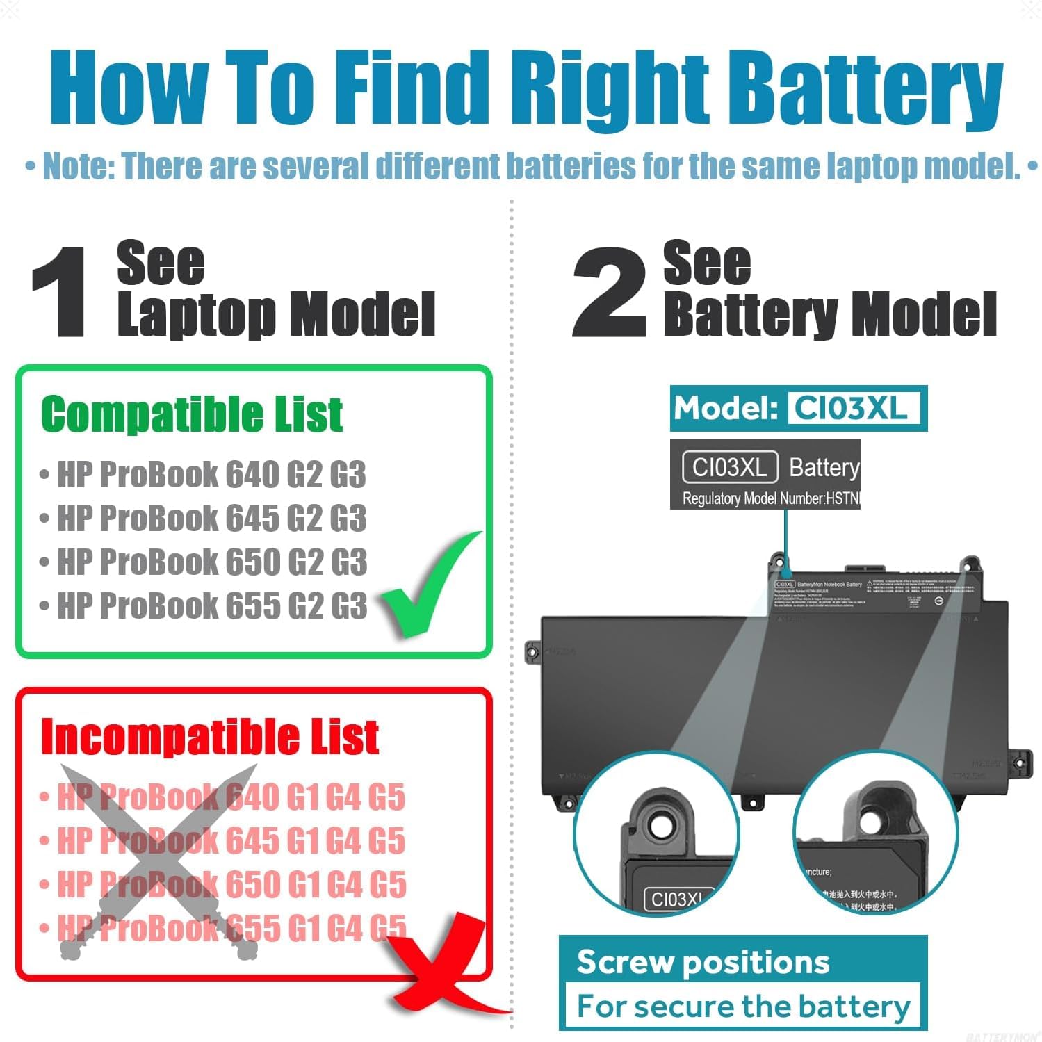 R & I Compatible part numbers Compatible Part Numbers 801517-421 801517-541 801517-831 801554-001 CI03 CI03048XL CI03XL CIO3 CIO3XL HSTNN-I66C-4 HSTNN-I66C-5H HSTNN-I66C-5U HSTNN-I67C-4 HSTNN-I67C-5 HSTNN-PB6K HSTNN-UB6Q T7B31AA Fits Laptop Models ProBook 640 ProBook 640 G2 ProBook 640 G2(1AZ89AW) ProBook 640 G2(1AZ92AW) ProBook 640 G2(1EP57EA) ProBook 640 G2(1MY61EC) ProBook 640 G2(2493542) ProBook 640 G2(L8U34AV) ProBook 640 G2(T9D93AW) ProBook 640 G2(T9X00ET) ProBook 640 G2(T9X02EA) ProBook 640 G2(T9X07EA) ProBook 640 G2(T9X60EA) ProBook 640 G2(T9X60ET) ProBook 640 G2(T9X62EA) ProBook 640 G2(T9X62ET) ProBook 640 G2(V1A92ET) ProBook 640 G2(V1P73UT) ProBook 640 G2(V3Q58AV) ProBook 640 G2(W6D99AW) ProBook 640 G2(W6E02AW) ProBook 640 G2(Y3B42ES) ProBook 640 G2(Y3B43ES) ProBook 640 G2(Y3B44ES) ProBook 640 G2(Y3B61EA) ProBook 645 ProBook 645 G2 ProBook 645 G2 (L8X65AV) ProBook 645 G2 (L8X66AV) ProBook 645 G2 (L8X67AV) ProBook 645 G2 (L8X68AV) ProBook 645 G2 (T9E09AW) ProBook 645 G2 (V1P75UT) ProBook 645 G2 (V1P77UT) ProBook 645 G2 (W6F33AW) ProBook 645 G2 (W8H13PA) ProBook 645 G2 (Y3B26ET) ProBook 645 G2(2612967) ProBook 645 G2(L8X65AV) ProBook 645 G2(L8X66AV) ProBook 645 G2(L8X67AV) ProBook 645 G2(V1P75UT) ProBook 645 G2(V1P77UT) ProBook 645 G2(Y3B26ET) ProBook 645 G2(Z2W17EA) ProBook 650 ProBook 650 G2 ProBook 650 G2 (L8U45AV) ProBook 650 G2 (L8U47AV) ProBook 650 G2 (L8U48AV) ProBook 650 G2 (L8U49AV) ProBook 650 G2 (L8U50AV) ProBook 650 G2 (L8U51AV) ProBook 650 G2 (L8U52AV) ProBook 650 G2 (L8U53AV) ProBook 650 G2 (T9E25AW) ProBook 650 G2 (T9E28AW) ProBook 650 G2 (W6E05AW) ProBook 650 G2 (W6E08AW) ProBook 650 G2(1AZ95AW) ProBook 650 G2(1EM33EA) ProBook 650 G2(1EP27EA) ProBook 650 G2(L8U48AV) ProBook 650 G2(L8U52AV) ProBook 650 G2(L8U53AV) ProBook 650 G2(T4J06ET) ProBook 650 G2(T4J10EA) ProBook 650 G2(T4J10ET) ProBook 650 G2(T9X61EA) ProBook 650 G2(T9X61ET) ProBook 650 G2(V1A44ET) ProBook 650 G2(V1A93ET) ProBook 650 G2(V1B89EA) ProBook 650 G2(V1C09EA) ProBook 650 G2(V1C17EA) ProBook 650 G2(V3Q59AV) ProBook 650 G2(W6E05AW) ProBook 650 G2(Y3B05EA) ProBook 650 G2(Y3B07EA) ProBook 650 G2(Y3B07ET) ProBook 650 G2(Y3B16ET) ProBook 650 G2(Y3B47ES) ProBook 650 G2(Y3B64EA) ProBook 650 G2(Z2U75ES) ProBook 650 G2-Y3B47ES ProBook 655 ProBook 655 G2 ProBook 655 G2 (L8Z52AV) ProBook 655 G2 (L8Z53AV) ProBook 655 G2 (L8Z54AV) ProBook 655 G2 (L8Z55AV) ProBook 655 G2 (T9E18AW) ProBook 655 G2 (W6S31AW) ProBook 655 G2 T9X09ET