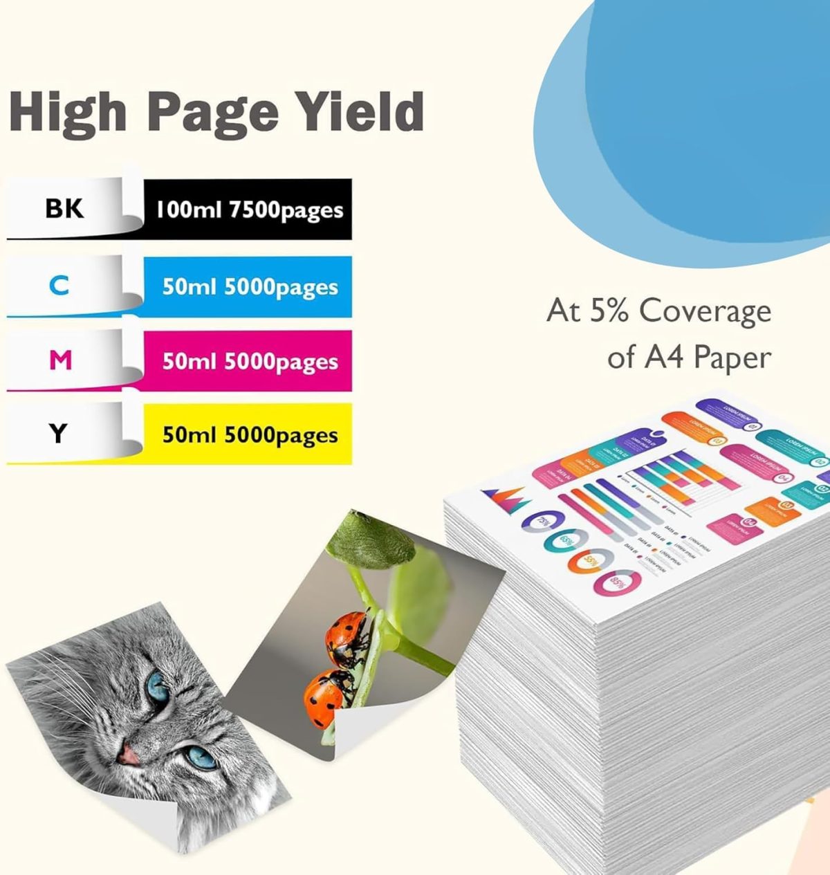 High Yield & Easy to refill — Black : 100 ML , Color : 50 ML ; 7500 Pages/Black , 5000 Pages/Colors as per printing at 5% coverage