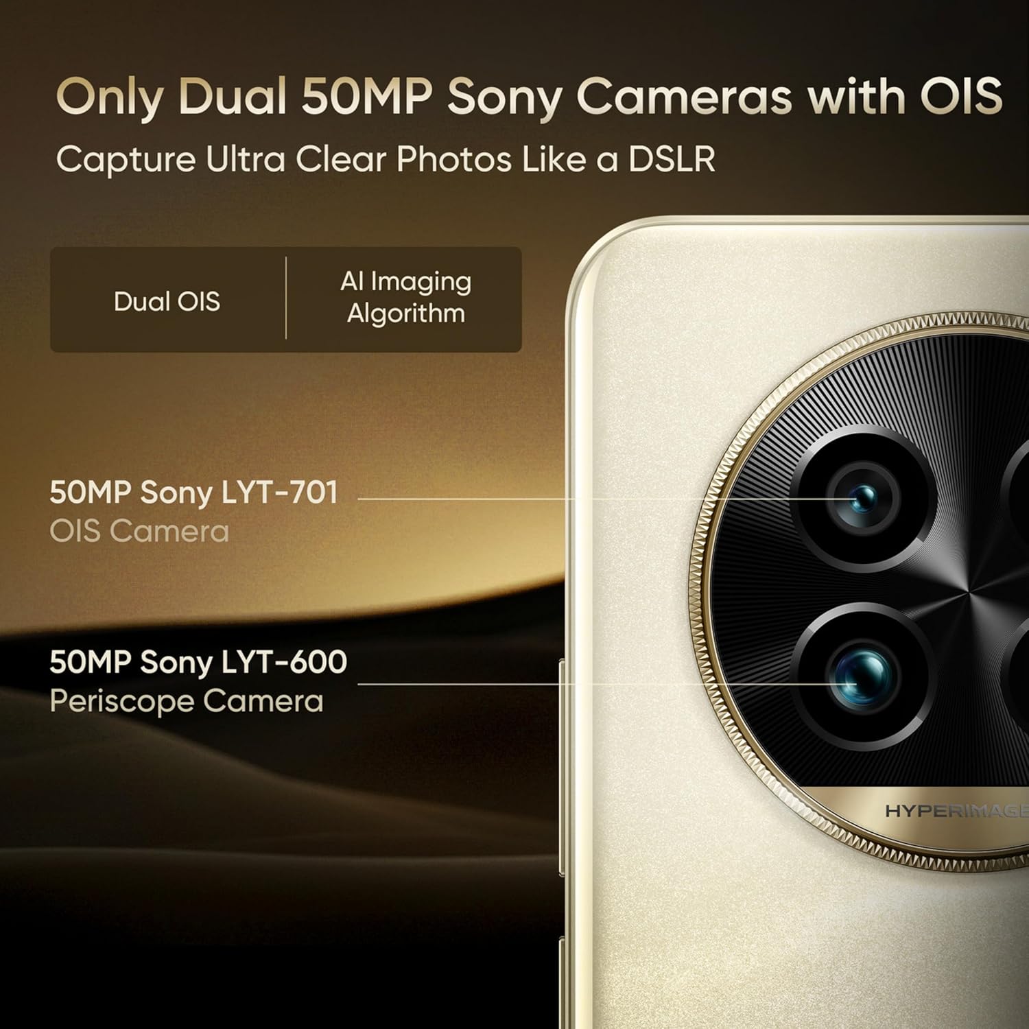 Ultra-Clear Camera with AI: Scene recognition + AI HDR deliver crisp detail and balanced highlights, day ho ya night. Sony Periscope OIS Camera: Stable zoom portraits & distant shots; OIS reduces shake for sharper photos and steadier videos. NEXT AI Ultra Clarity: Intelligent de-noise and texture restore for lifelike skin tones without over-processing. 120Hz Curved Vision Display: Ultra-smooth scrolling, 2160Hz PWM dimming for comfortable viewing, toughened glass protection. Monet-Inspired Design: Elegant wave finish with premium circular camera ring—lightweight, ergonomic grip, true style of realme.