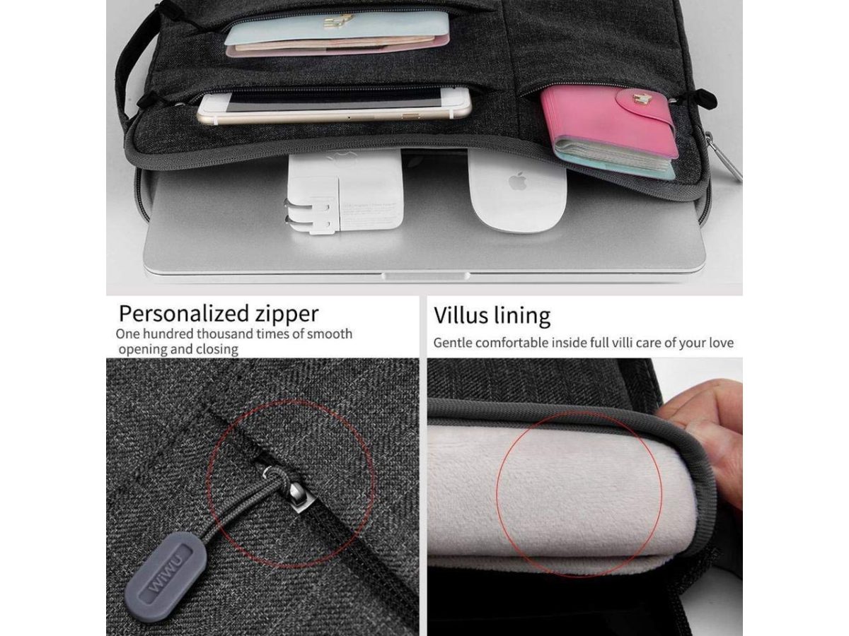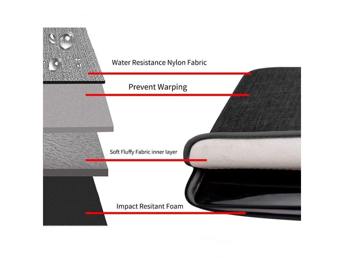 Material: Woollen fabric coated neoprene with faux fur lining made of soft materials, special charging port at the bottom Perfect size: Internal size – 15.74” x 11.02” x 2.36, external size-16.90” x 12.20” x 2.36”. This protective sleeve case fits perfectly for all 15.4 macbook pro/retina/other 15-15.6 inch laptop/tablet Design: Two wide compartments made of soft faux fur lining inside the sleeve protect laptop from being shocked and scratched Space: Wide compartment for laptop and one hidden compartment for confidential documents or small items such as power adapters, documents, notepads and cell phones, offering added convenience Slim, portable and lightweight to take alone or slide it into your briefcase, backpack or any other bag, perfect for business, school or travel