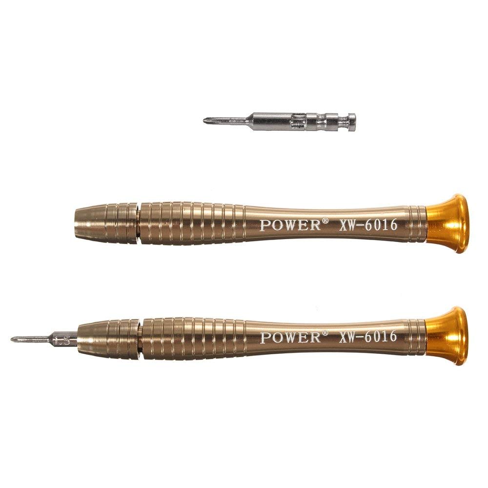 Packaged included: 1 x Screwdriver Handle Torx: T2, T3, T6, T8, Pentalobe: 0.8 (?), 1.2 (?) Phillips: 1.0 (+), 1.2 (+), 1.5 (+) Flat: 2.0 1.5 (-) (-) 1 x Sim Card Opener: 0.8 (?) 1 x suction cup 1 x Pry Tools 1 x leather bag