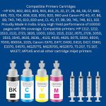 Compatible Printers Cartridges- 805, 860, 861, 803, 680, 678, 682, 818, 802, 901, 703, 704, 702, 831, 830, 46, 21, 22, 27, 28, 56, 57&, PG88, CL98, PG745, CL746, PG810, CL811, PG740, CL741, PG40, CL41, PG89, CL99, PG830, CL831 Compatible printers: 1112, 1212, 1510, 2131, 2723, 3835, 1000, 1010, 1515, 2132, 2675, 2729, 3050, 3515, 3545, 3635, 3636, 4123, 4535, 4625, 5075, 5550, 6500, 7000, 6500A, 1015, Can: E470, E477, E400, E410, E417, E560, E3370, E4570, MG2577S, MG2570S, MG3570, TS 207, TS 307, MX377, MP145 and all other cartridge inkjet printers Enjoy High Yield & Easy to refill — 4000 Pages/Black, 6500 Pages/Colours per Bottle at 5% coverage Pages. How To Refill: Suck required ink into syringe from the ink bottle. Around 3 -5 ML is required to fill in each colour holes and 3 ML – 15 ML in black cartridge. It Depends on your Cartridge mode, slowly push the piston of the syringe into the hole. It should be very slow and careful. Do not overfill the sponge. Watch carefully while injecting