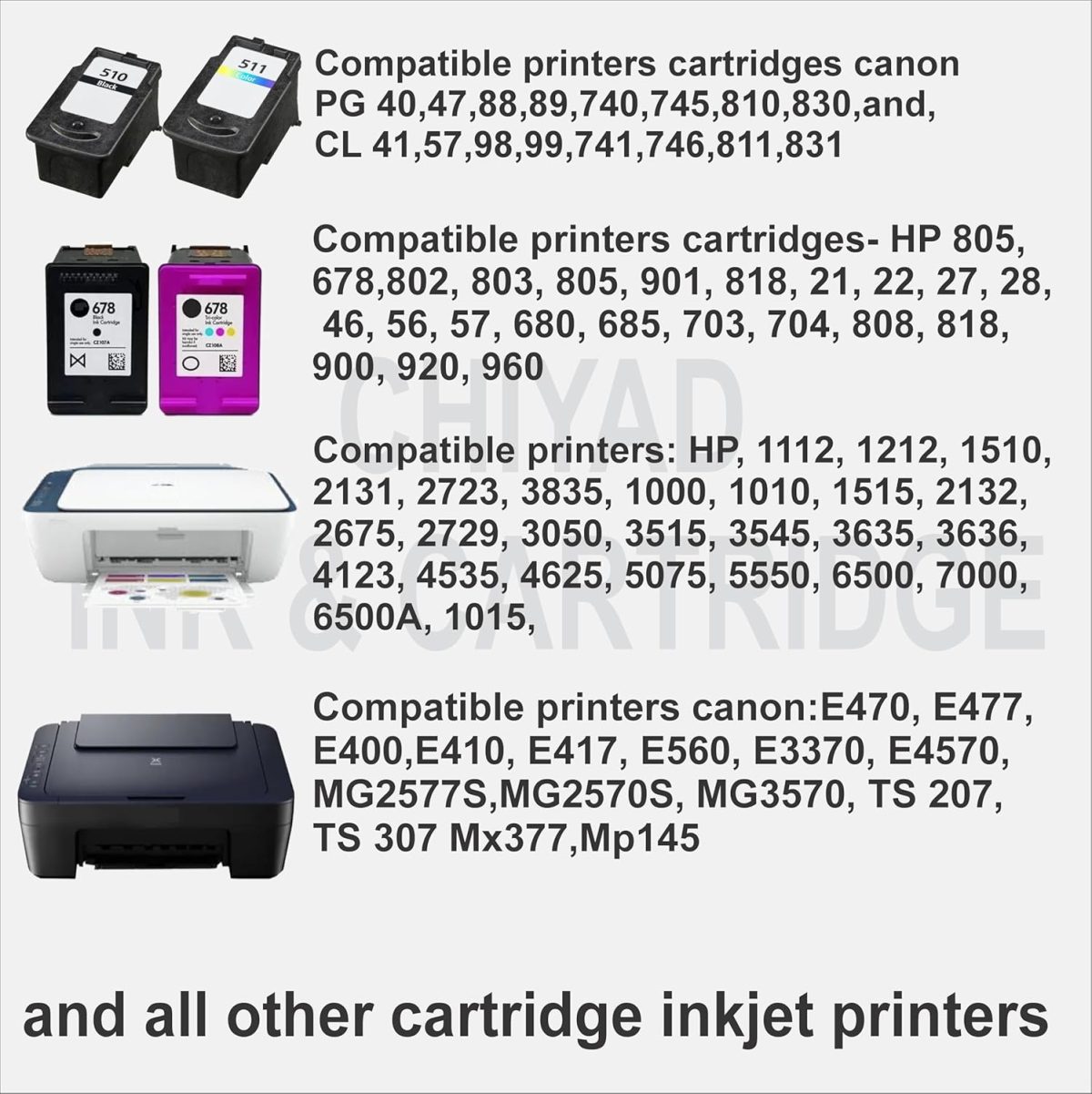 Compatible printers: 1112, 1212, 1510, 2131, 2723, 3835, 1000, 1010, 1515, 2132, 2675, 2729, 3050, 3515, 3545, 3635, 3636, 4123, 4535, 4625, 5075, 5550, 6500, 7000, 6500A, 1015, Can: E470, E477, E400, E410, E417, E560, E3370, E4570, MG2577S, MG2570S, MG3570, TS 207, TS 307, MX377, MP145 and all other cartridge inkjet printers