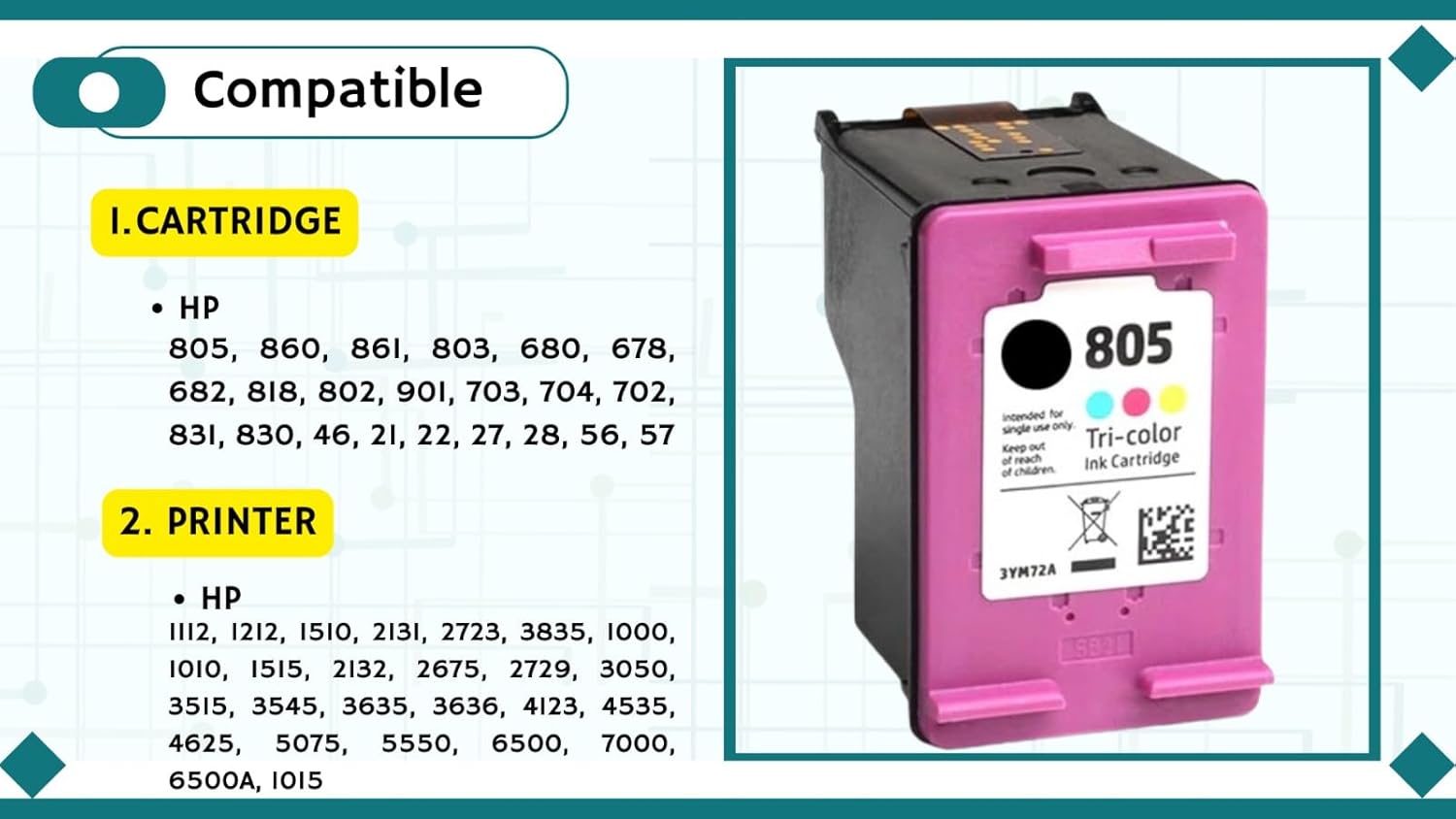 Compatible Printers Cartridges- 805, 860, 861, 803, 680, 678, 682, 818, 802, 901, 703, 704, 702, 831, 830, 46, 21, 22, 27, 28, 56, 57&, PG88, CL98, PG745, CL746, PG810, CL811, PG740, CL741, PG40, CL41, PG89, CL99, PG830, CL876