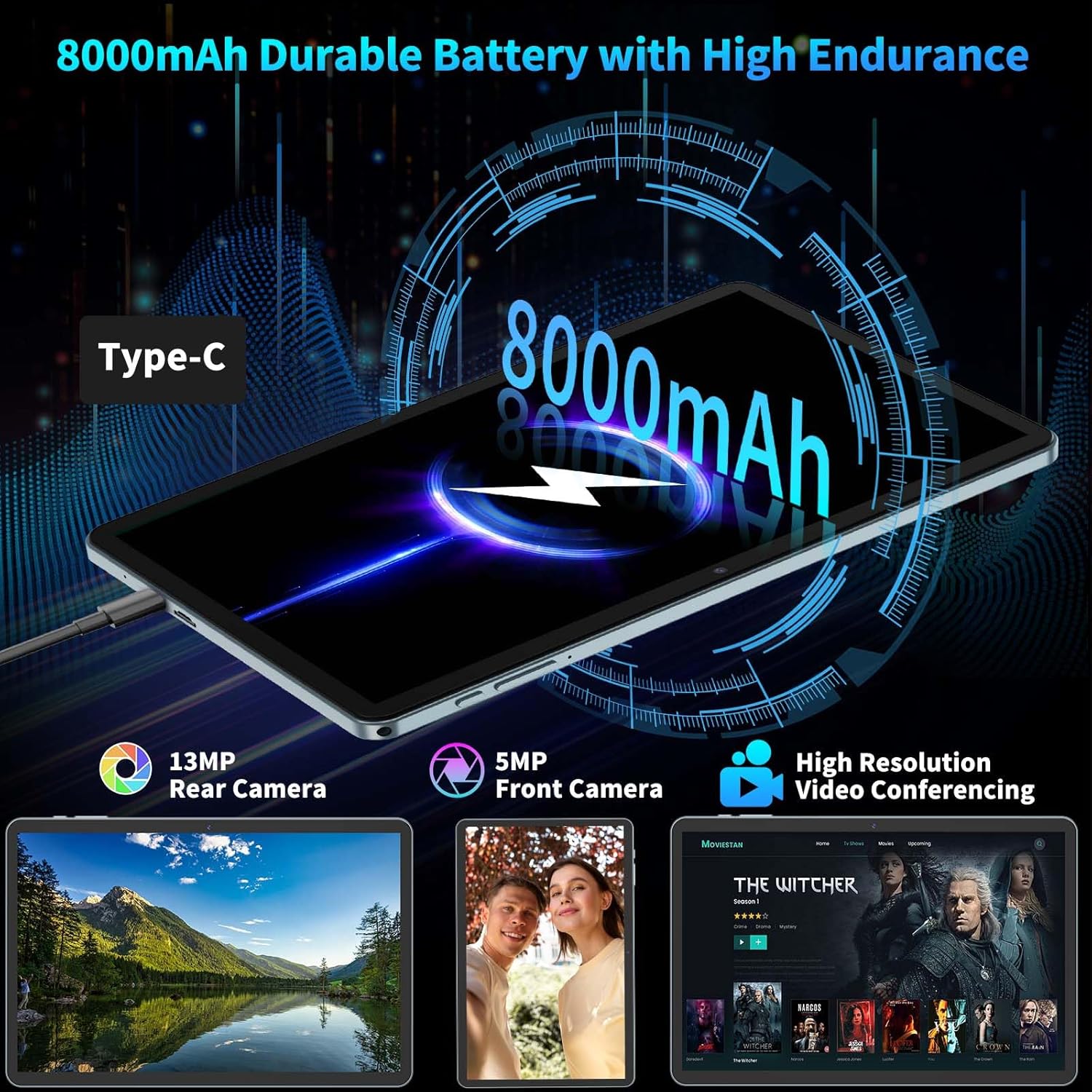 【8000mAh Battery & Dual Cameras】8000mAh USB Type-C battery ensures long lasting use of the tablet, making it suitable for travel, travel and outdoor activities. 5MP front camera and 13MP rear camera can meet your daily photography and video call needs. You can also use it to record videos and record your daily life