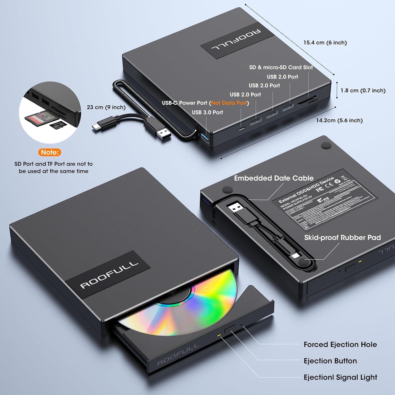 【Built-in Hub & SD Card Reader】Many modern laptops/Macs no longer have a built-in CD/DVD drive, and some come with only USB-C ports. The ROOFULL RF40-SU DVD drive is designed to solve both problems in one compact device. In addition to reading and writing discs, it adds multiple USB 3.0/2.0 Type-A ports and built-in SD and microSD card readers. You can easily connect wired mice, keyboards, hard drives, flash drives, 2.4G receivers, and more without needing extra hubs or adapters. It’s also ideal for importing photos and videos from cameras or security devices