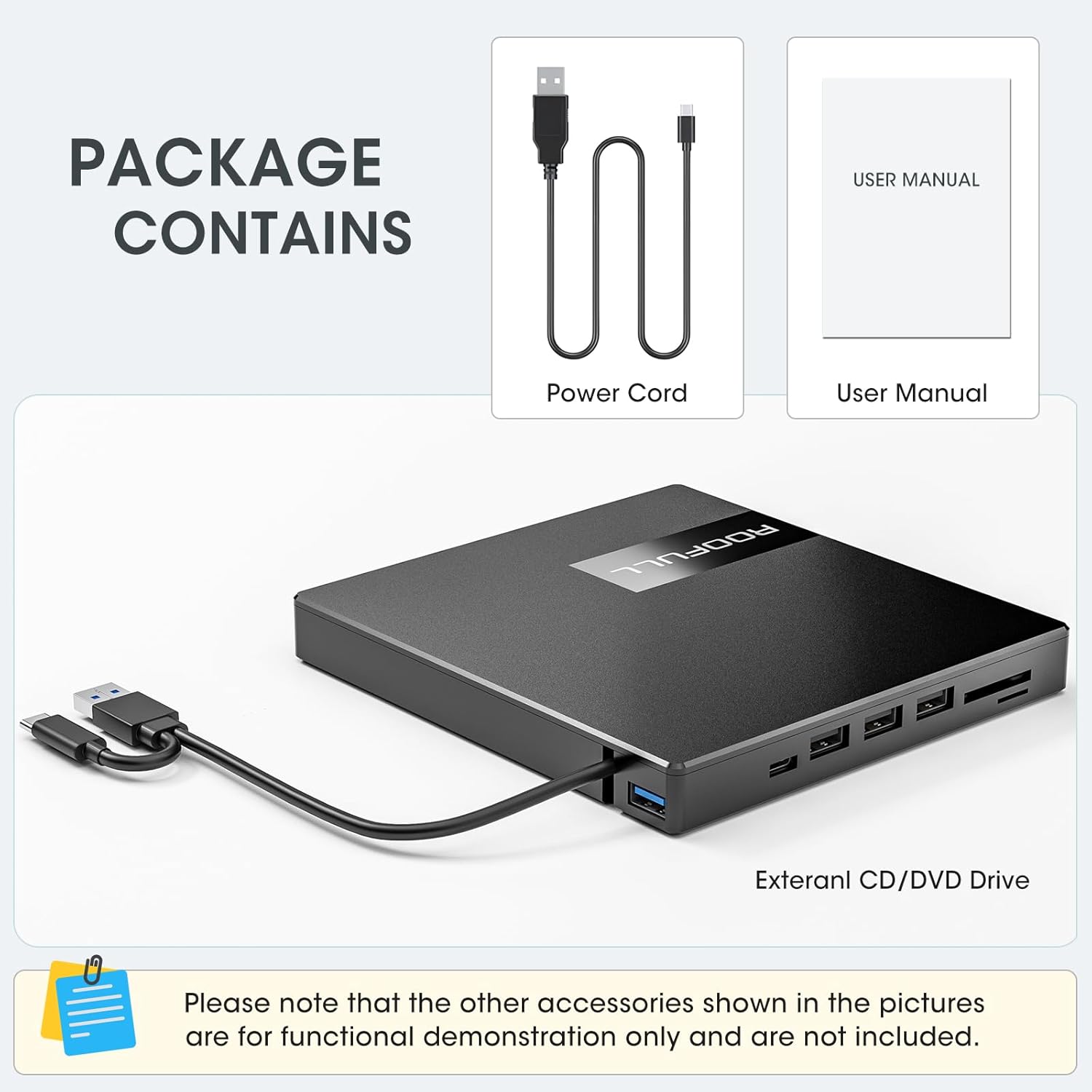 【Slim & Portable DVD Player】Compact and ultra-light, this CD/DVD drive easily slips into your laptop bag, ready to go wherever you do—home, office, or travel. It’s the perfect gift for anyone who loves their CD and DVD collections. Plus, the built-in data cable tucks away neatly underneath, so no extra cords to carry or lose. Just plug in and play, anytime, anywhere! Package includes: 1× multifunction CD/DVD drive, 1× USB power supply cord, 1× user manual. (Note: Other accessories shown in the picture are for demo only and not included.)