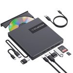 【Plug & Play Multifunctional CD/DVD Drive for Laptop】If you need a durable external CD/DVD drive for reading and writing discs, and also want enough ports for connecting other peripherals, this well-rated 8-in-1 multifunctional disk drive is an ideal solution. No complex setup—simply plug the data cable (neatly stored underneath the drive) into your laptop or Mac, and it will be recognized automatically. Insert your CD or DVD and use your preferred software to play, burn, or rip content. Tips: On Mac, the disc icon will appear on the desktop once the disc is inserted and successfully read. (Scroll down for recommended software and usage tips.)