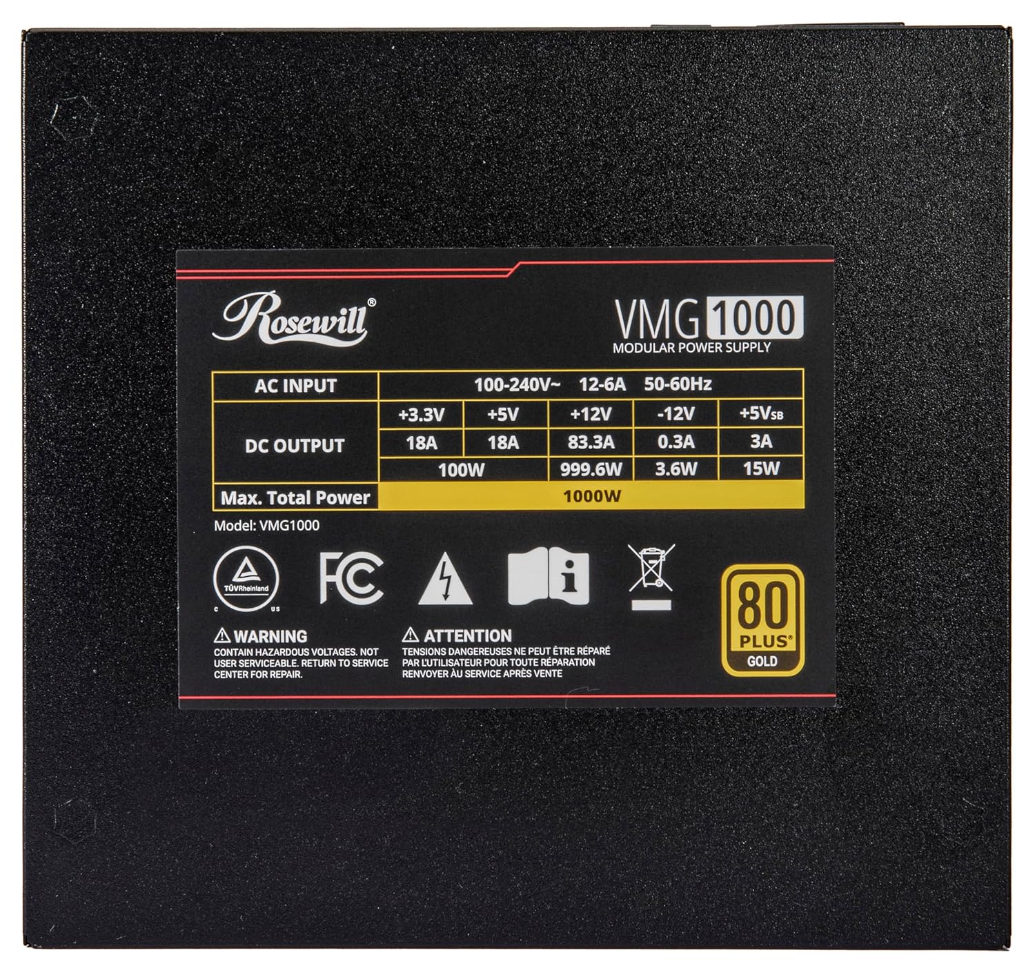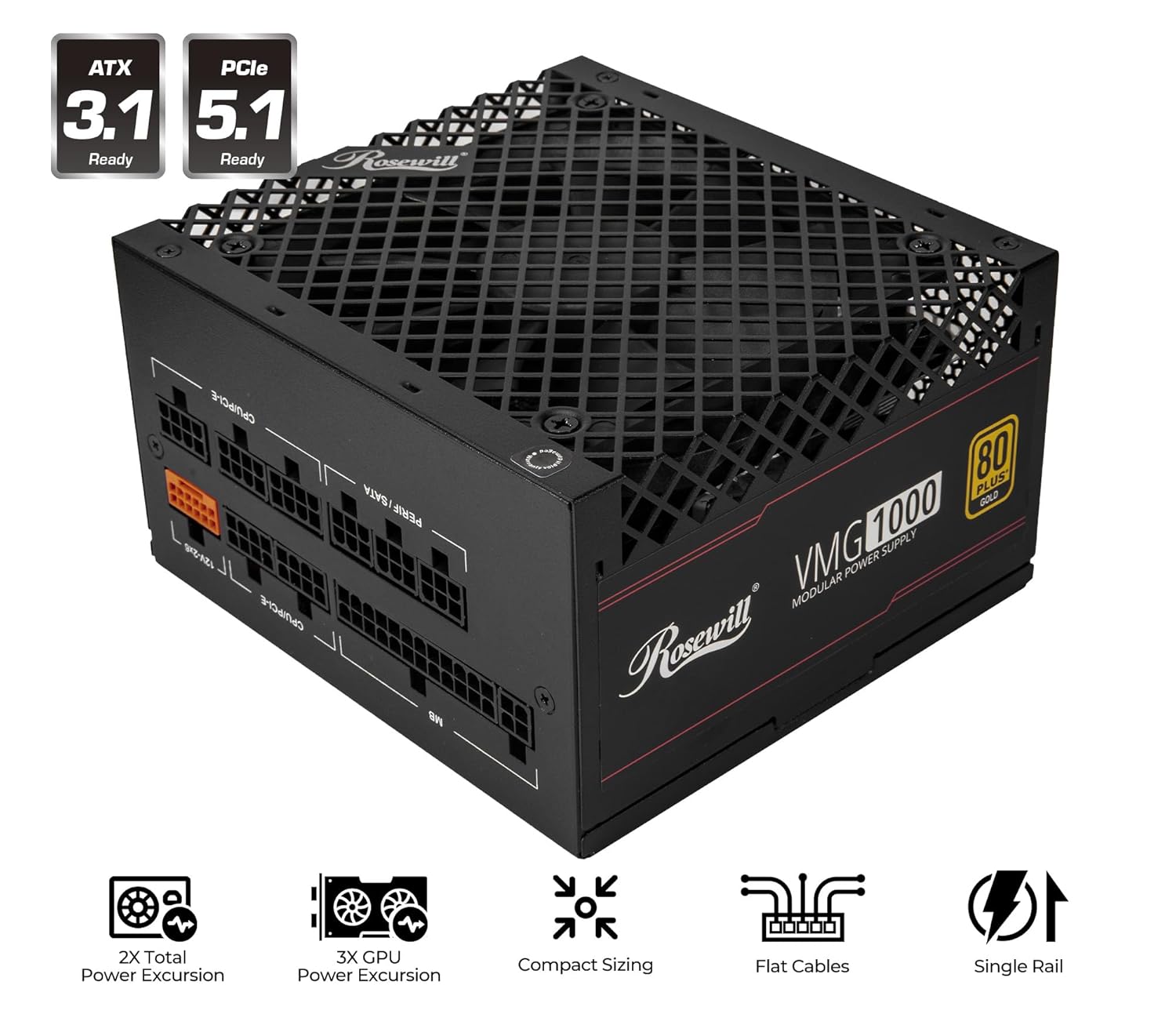 Rosewill VMG 1000W 80+ Gold, ATX 3.0 & 3.1 Compatible, Full Modular Low-Noise Power Supply, PCIe 5.1 12V-2×6 Connector, 100% Japanese Capacitor, 120mm FDB Silent Fan – 5 Year Warranty