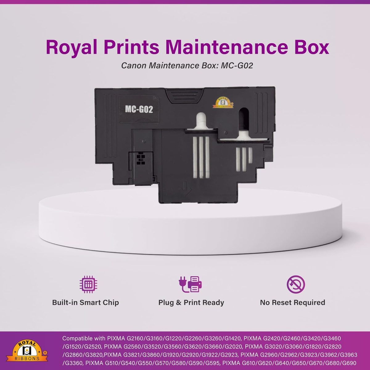 Keep Your Printer Running Smoothly with Royal Prints MC-G02 Maintenance Box – Smart, Reliable & Hassle-Free. Ensure peak performance from your Canon PIXMA G Series printer with the Royal Prints MC-G02 Maintenance Box, designed to absorb excess ink and extend your printer’s life. This factory-sealed, high-quality replacement cartridge is equipped with a built-in smart chip that allows real-time ink monitoring—so your printer alerts you exactly when a replacement is needed. Whether you’re working from home, running an office, or managing bulk printing tasks, our maintenance box is a plug-and-play solution—no technical resets or complicated setup required. Just insert and print! 📦 Compatible Canon PIXMA Printer Models: G1020, G1220, G1420, G1520, G1820, G1920, G1922, G2020, G2021, G2060, G2160, G2260, G2420, G2460, G2520, G2560, G2620, G2860, G2920, G2923, G2960, G2962, G3020, G3021, G3060, G3160, G3260, G3360, G3420, G3460, G3520, G3560, G3620, G3660, G3820, G3821, G3860, G3920, G3923, G3960, G3962, G3963, G510, G540, G550, G570, G580, G590, G595, G610, G620, G640, G650, G670, G680, G690, G570, G670