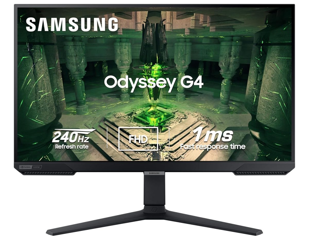 Samsung 27″ (68.4cm) Odyssey G4 IPS Gaming Monitor|FHD 1920 x 1080|240Hz|1ms|400nits|SRGB 99%|Ports-HDMIx2,DP,Headphone|DP Cable|Height-Tilt-Pivot Adjustable Stand|Nvidia G-Sync|LS27BG400EWXXL|Black