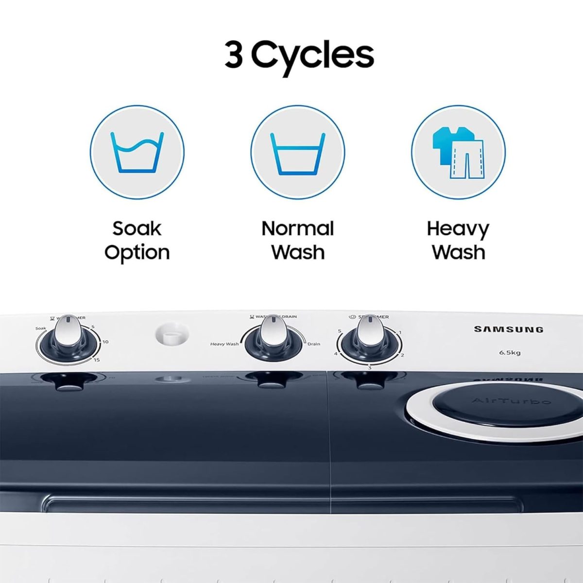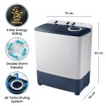 Semi-Automatic top load washing maching: Economical, Low water and energy consumption Capacity 6.5 kg: Suitable for 3 – 4 members | Water Pressure: (0.05~0.3MPa)(0.5~3.0kg.f/cm²) | Water Consumption : Refer to BEE label Energy Star rating : 5 Star- Best in class efficiency | Energy Consumption: 0.0131 KWh/kg/cycle (For more information refer to BEE Label) Warranty: 2 years comprehensive warranty on product and 5 Year Warranty on Wash Motor (T&C Apply) (Note: Brand Warranty can be availed using seller invoice) Motor: 1300 RPM: Higher spin speeds helps in faster wash and drying. With its high speed and efficiency, it’s perfect for busy households or those who want to get laundry done quickly and effectively Wash Programs: 2 Wash Programs – Normal| Option List : Soak| Additional Cycle : Heavy Drum Type: PP Plastic, Pulsator : Dual Storm & Plastic Body Air Turbo Drying – Reduce drying times by removing more water using the Air Turbo Drying System. Semi-Automatic top load washing maching: Economical, Low water and energy consumption Additional Features: Rat Mesh Protection| Rust-proof Body| Caster Wheel (Note: User manual can be accessed from brand website)