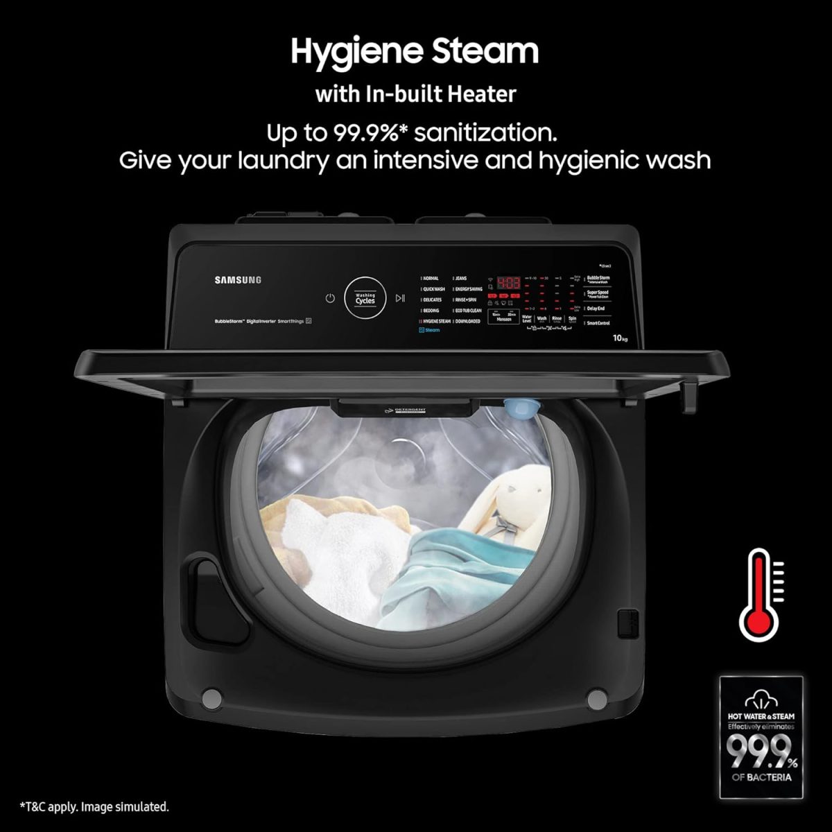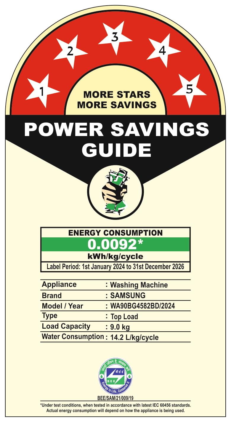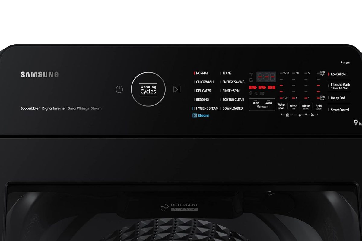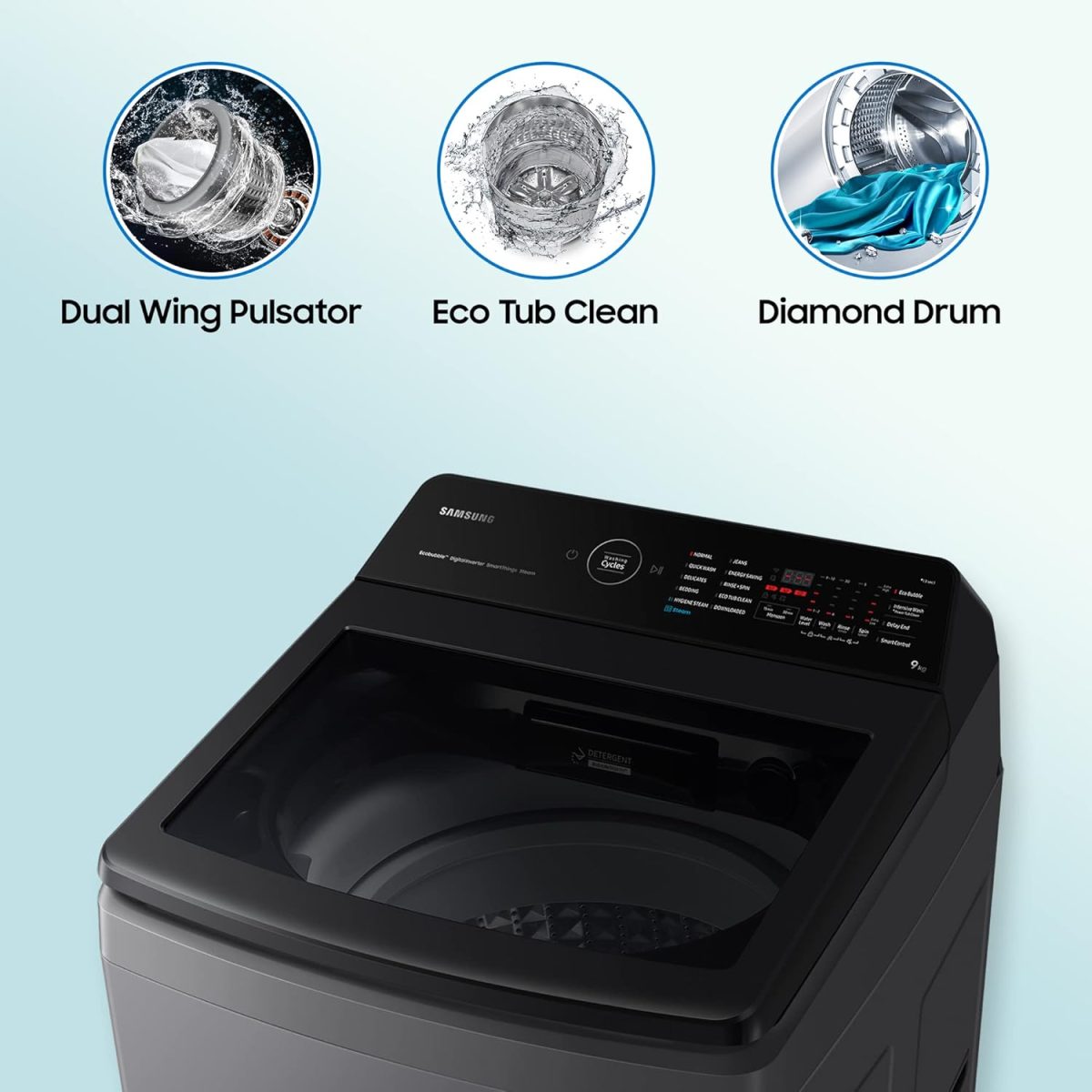 Fully-Automatic Top Load Washing Machine: Affordable With Great Wash Quality, Easy To Use Capacity : 9 Liters: Suitable For Large Families Energy Star rating : 5 Star- Best in class efficiency | Digital Inverter for energy savings | Energy Consumption : Refer to BEE label 2 Years comprehensive on product, 20 Years on Digital Inverter Motor: 680 RPM: Higher spin speeds helps in faster wash and drying. Wash Programs: 9 No.of Programs – [Hygiene Steam, Bedding, Delicates, Eco Tub Clean, Energy Saving, Jeans, Normal, Quick Wash, Rinse + Spin] Drum Type: Diamond| Body material: Stainless Steel, Drum Material : Stainless Steel & Plastic Body Panel Display : Red LED Digital Display, Suitable for hard water washing Key Performance Features: Eco Bubble, BubbleStorm, Dual Storm, Hygiene Steam, Magic Filter, Monsoon, Smart Control, Smart Check Additional Features: Auto Restart, Child Lock, Delay End, Door Lock, Intensive Wash, Soft Closing Door, Tempered Glass Window
