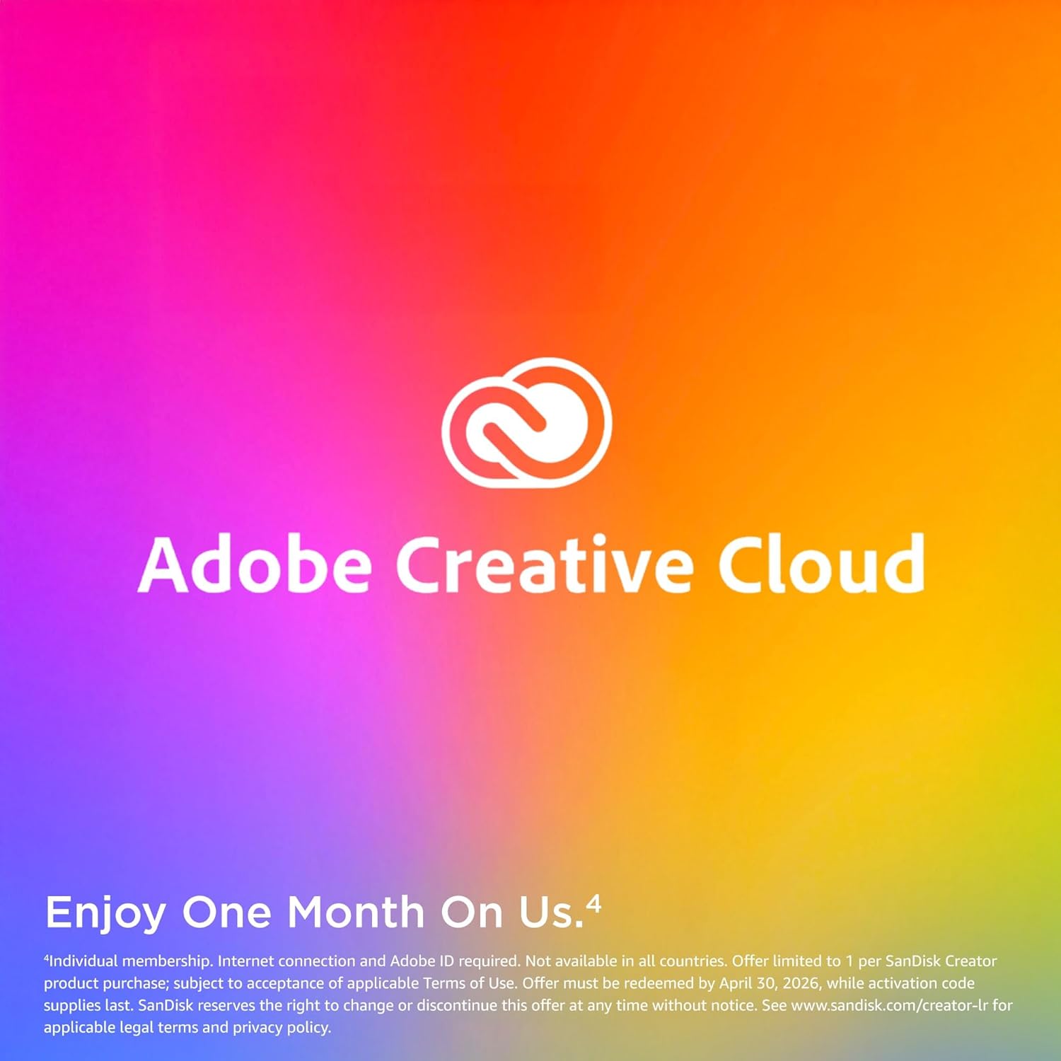 (5) Individual membership. Internet connection and Adobe ID required. Not available in all countries. Offer limited to 1 per SanDisk Creator product purchase; subject to acceptance of applicable Terms of Use. Offer must be redeemed by April 30, 2026, or while activation code supplies last. SanDisk reserves the right to change or discontinue this offer at any time without notice. See official SanDisk website for applicable legal terms and privacy policy.