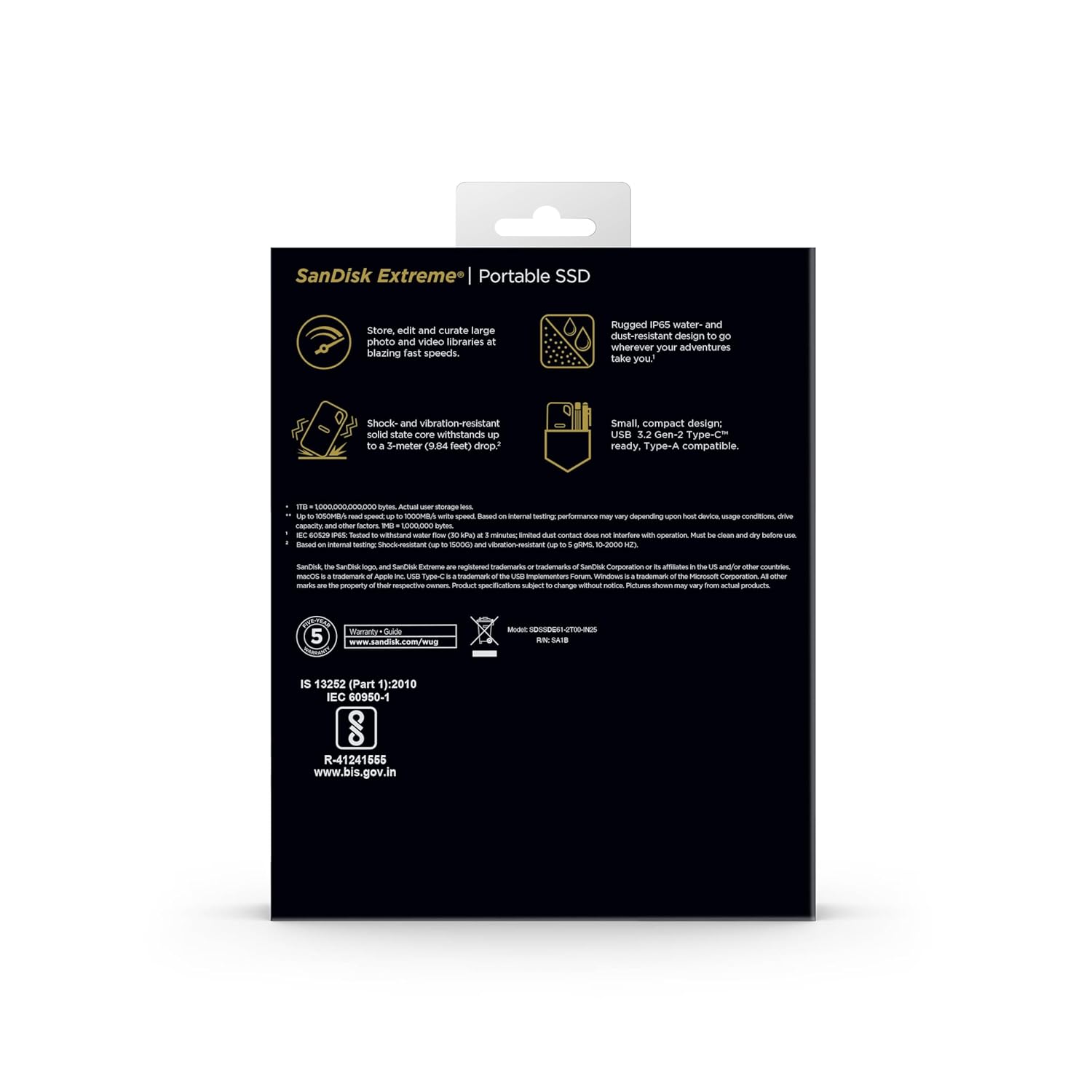 The SanDisk Extreme® Portable SSD keeps up with your active lifestyle, thanks to speeds up to 1050MB/s** read and a massive storage capacity. No matter where you explore, this drive is tough enough to handle it. It’s drop-proof up to 3 meters***, and IP65 water and dust resistant†. Plus, a handy carabiner loop lets you clip it securely to your bag. Trusted by professional photographers, the SanDisk Extreme® Portable SSD is the perfect blend of speed, durability, and peace of mind. Backed by a 5-year warranty††, you can capture and store your favorite memories with confidence.