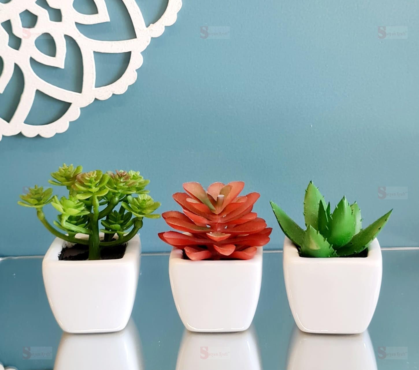 Package Includes: 3 Pcs Small Artificial Flower Small Succulent with ceramic pot. / Size: 6 x 8 cm (L x H) / Material : Pot – Ceramic , Plant – Rubber ( Note: This is a small-sized artificial Succulent plant set) Product color may slightly change due to photographic lightning. Maintenance free : No watering, sunlight, or pruning needed! Our artificial potted Flowers offer hassle-free maintenance, allowing you to enjoy the beauty of greenery without the time and effort required for live Flowers Ideal for – room decorations items, office decoration items, office table accessories, living room decor, miniature decor items, table decorative items, bedroom decor, artificial plant with pot, artificial plant with pot, center table decorative items, office table decorative items, bonsai pot, show pieces for living room stylish,succulent pot Home Office Decoration. The realistic greenery looks very lifelike and lovely. Its small size allows you to put it anywhere like office, home, dining room table, cabinet, desk, bookshelf and window ledge. Premium Material Quality :Crafted from high-quality rubber plants in elegant ceramic pots, offering durability, colorfastness, and a premium finish that enhances any décor theme. Perfect For : Home décor, living room, bedroom, bathroom, balcony, kitchen, bookshelf, Office desk decoration & workspaces, Wedding decorations & party table centrepieces, Festive décor for Diwali, Deepawali, Navratri, Christmas, New Year, Housewarming gifts, birthday gifts & corporate gifting, Return gifts, gift hampers BEST FOR : Our delicate flower is popular for all kinds of occasions to decorate your table, entrance, bedroom, living room, kitchen, or office space. Perfect gift for Mother’s Day, to friends, families for wedding, party, anniversary, ceremony, home.