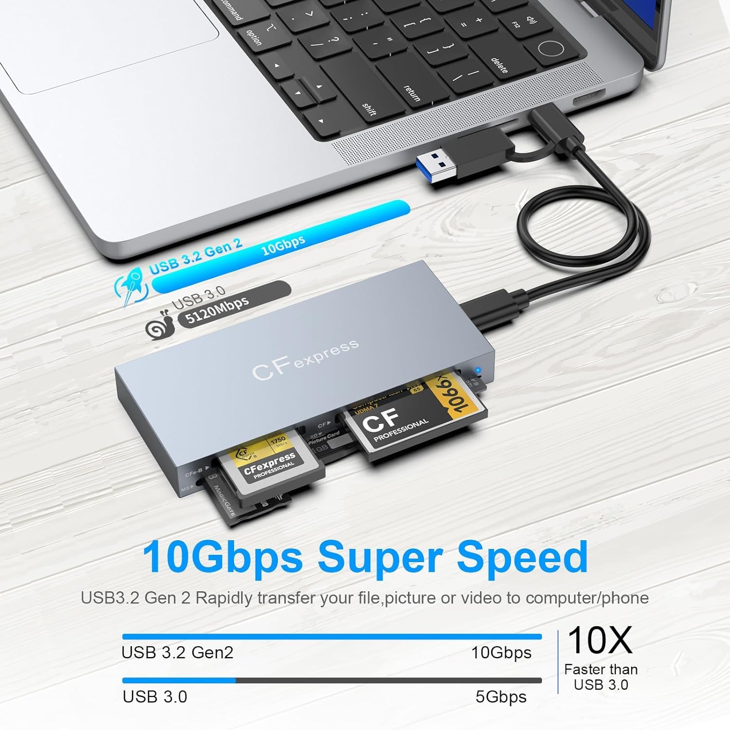 【10Gbps Professional CFexpress & Camera Card Reader 】6 in-2 multi slots Multi SD/CFexpress card readers. Supports CFexpress memory card data transfer. Transfer high-resolution images and video recordings to your computer faster and more efficiently, with fast USB 3.2(USB 3.2 Gen2 ) data transfer rate super-speed 10 Gbps(backward compatible with USB 3.1 Gen 1). With the LED indicator, you can easily monitor the connection status of the cfexpress type b reader.