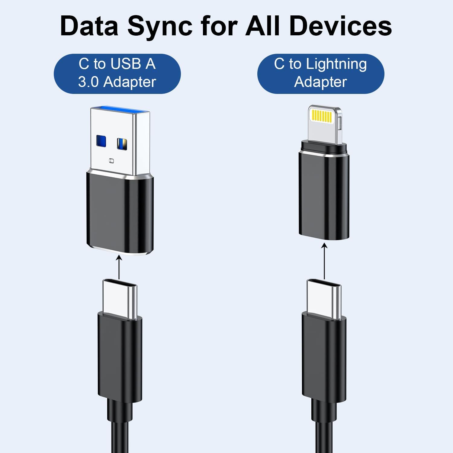 Included in the package are 1 multifunctional card reader, 1 USB C to USB C cable (1ft), 1 USB-C to Lightning Adapter, 1 USB-C to USB-A 3.0 Adapter, and 1 eject pin.