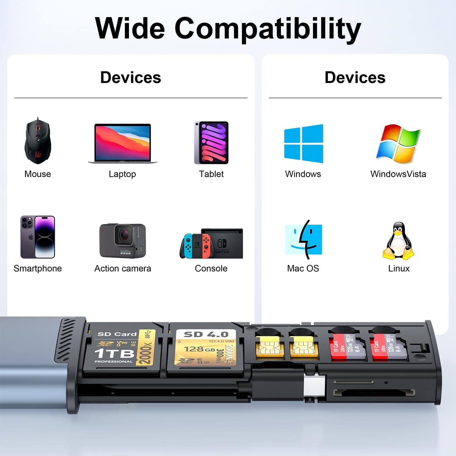 It supports various memory cards, including UHS-II and SD 4.0, and is compatible with Windows 7 and above, Mac OS 10 and above, Linux, Android, and iOS.