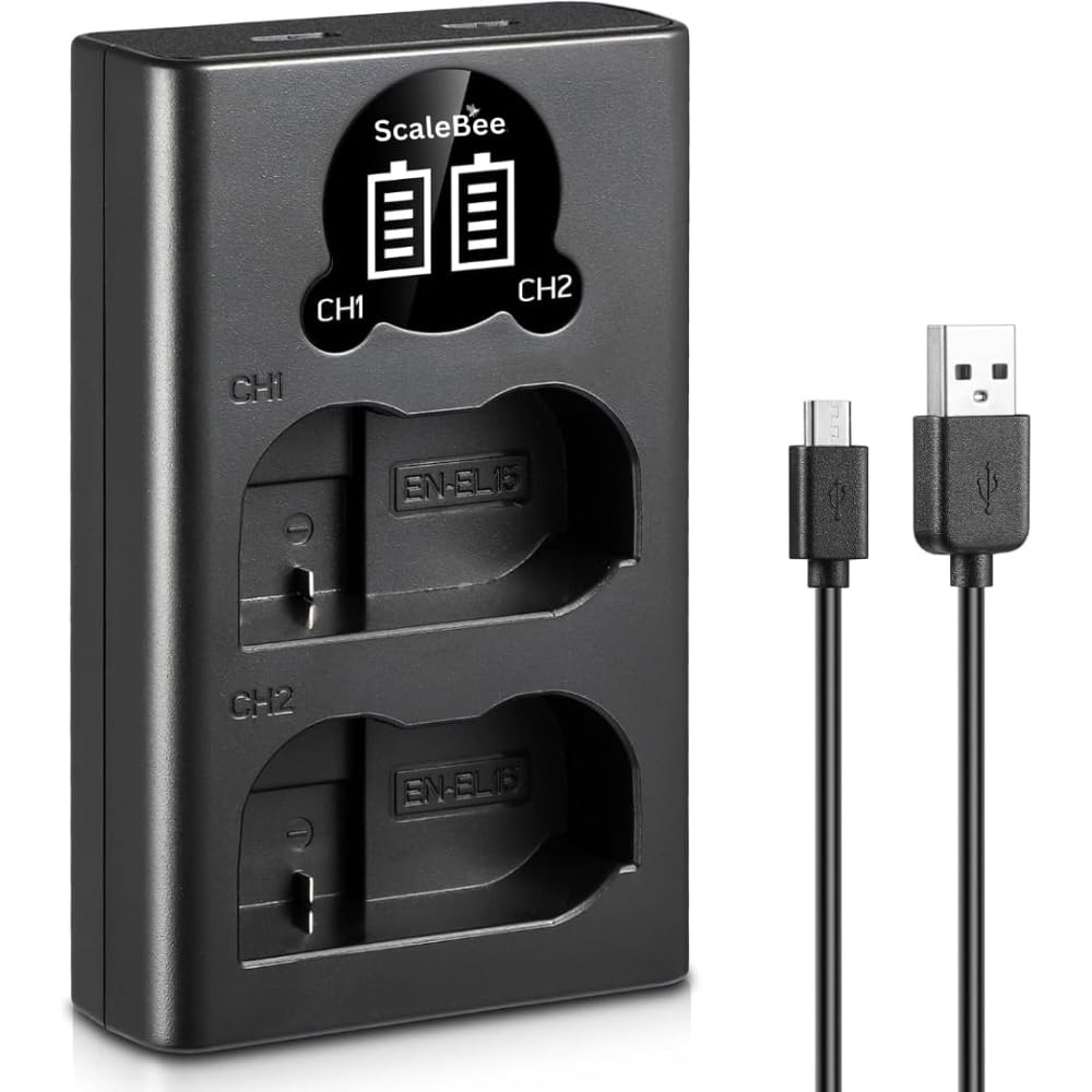 Scalebee ENEL15 dual slot battery charger for Nikon EN-EL15 EN-EL15a EN-EL15b EN-EL15c battery and replacement Nikon MH-25 MH-25a charger.