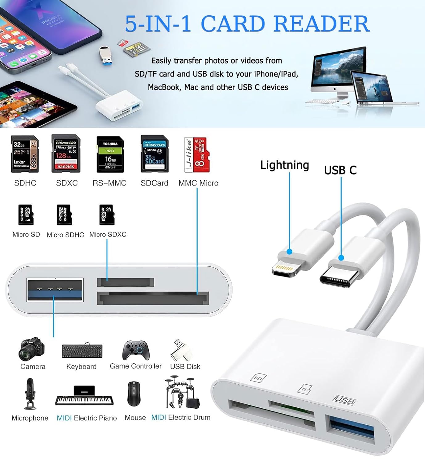USB C+Lightning Interface Card Reader: a versatile storage accessory designed to seamlessly manage data across Canon, Nikon, Sony, Samsung, Kodak SLR digital cameras, and Apple devices. This compact, multifunctional device effortlessly connects your iPhone/iPad with SD/TF and USB 3.0 capabilities, ensuring fast and reliable data transfer. Supporting SD, SDHC, Micro SD (TF) cards, USB flash drives, and various peripherals like game controllers and MIDI keyboards, it caters to both professional and everyday data needs. Experience high-speed data transfer up to 5 Gbps, allowing swift movement of photos, videos, movies, music, and documents between devices without the hassle of frequent plug-ins. Equipped with two-way transfer compatibility for iOS 13-16 devices, it offers seamless connectivity with Windows, Mac OS, Linux, and Android systems, all without requiring additional drivers or power sources—just plug and play.