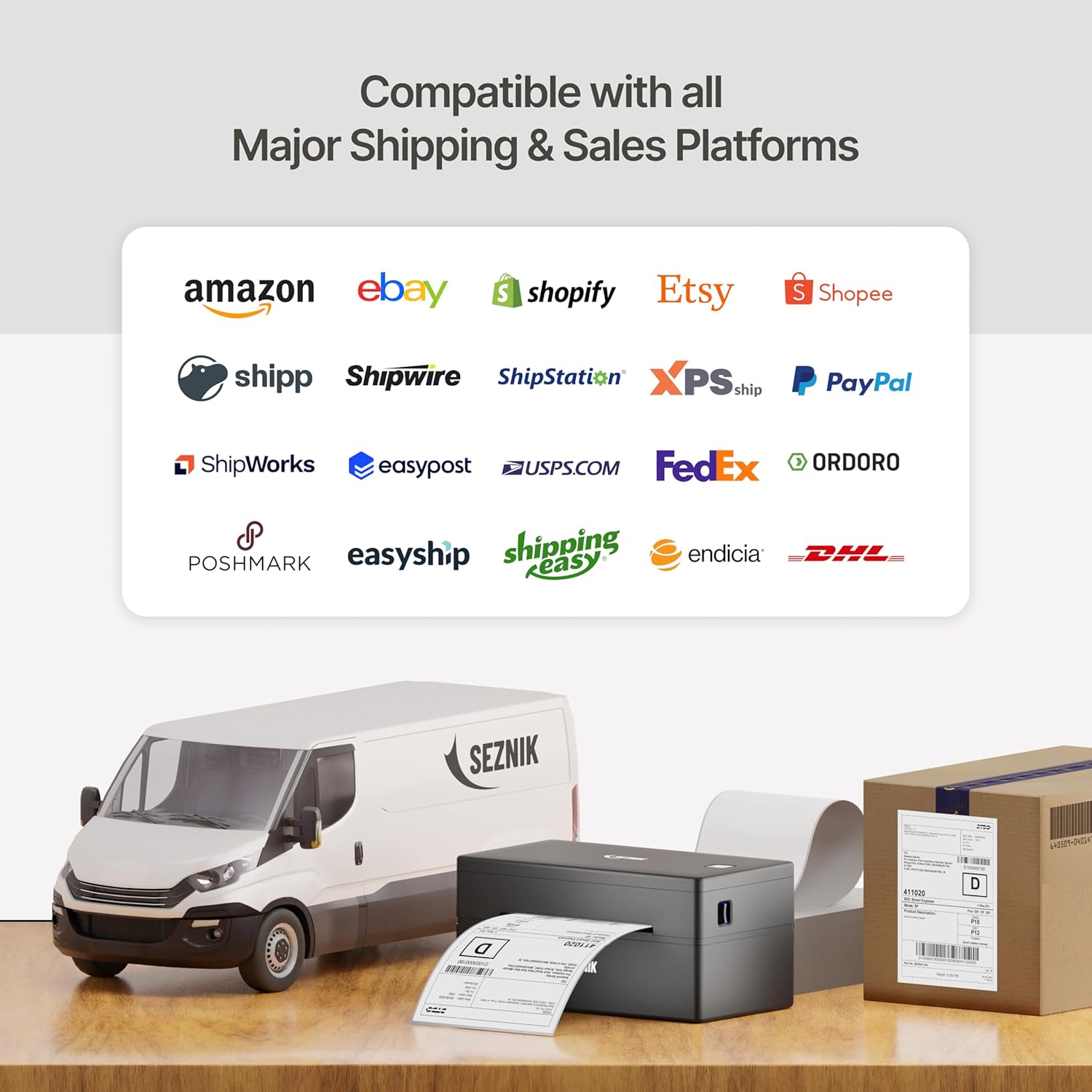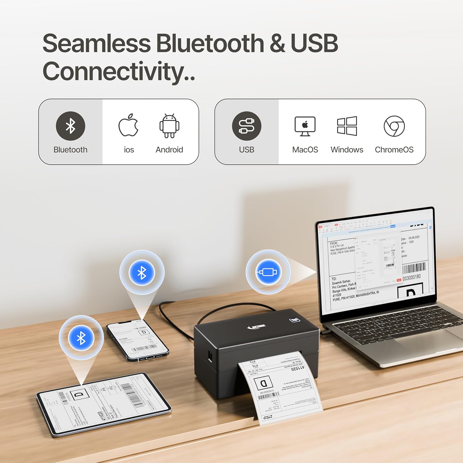 𝐇𝐈𝐆𝐇-𝐒𝐏𝐄𝐄𝐃 𝐏𝐑𝐈𝐍𝐓𝐈𝐍𝐆 : The Seznik Shipping Label Printer is designed to print labels directly from various e-commerce and express logistics platforms, such as Amazon, Flipkart, and Meesho, as well as office software like Microsoft and Adobe (Note: Print PDF files). Our thermal printer bluetooth is also compatible with label software like LuckJingle, meeting both business and home printing needs. With an impressive printing speed of 152 mm per second, this printer boosts productivity, allowing you to process large volumes of shipping labels for your e-commerce business, warehouse, or office efficiently. 𝐀𝐃𝐉𝐔𝐒𝐓𝐀𝐁𝐋𝐄 𝐋𝐀𝐁𝐄𝐋 𝐒𝐈𝐙𝐄 : The Seznik Shipping Label Printer excels in versatility, offering adjustable label sizes to meet diverse requirements. With a print width of 1.06″ to 4.25″ and a print length of 0.4″ to 70″, our thermal printer can handle nearly all label types. This includes shipping labels, FBA labels, certification labels, and food labels, ensuring compliance with regulations. Additionally, it supports circular, color and transparent thermal labels for price and warning labels. Its user-friendly design allows for quick label adjustments, making this thermal printer an efficient tool for businesses looking to streamline their labeling processes. 𝐄𝐀𝐒𝐘 𝐁𝐋𝐔𝐄𝐓𝐎𝐎𝐓𝐇 𝐂𝐎𝐍𝐍𝐄𝐂𝐓𝐈𝐕𝐈𝐓𝐘 : Our bluetooth thermal printer connects to both Android and iOS Mobiles using Bluetooth. Simply Download the App ‘FLASHLABEL’ into your mobile phone, may it be Android or iOS , and you’re ready to start printing. This functionality eliminates the need for complex installation procedures or additional software, making sticker machine printer user-friendly and accessible even for those with limited technical expertise. 𝐔𝐒𝐁 𝐂𝐎𝐍𝐍𝐄𝐂𝐓𝐈𝐕𝐈𝐓𝐘 : Setting up Printer is a breeze with its straightforward USB connection. Simply plug the printer into your computer’s USB port, and you’re ready to start printing. This plug-and-play functionality of label printer machine eliminates the need for complex installation procedures or additional software, making it user-friendly and accessible even for those with limited technical expertise. Install the barcode editor software comes with the product and enjoy hassle-free label creation, editing and printing. 𝐑𝐎𝐁𝐔𝐒𝐓 𝐃𝐄𝐒𝐈𝐆𝐍 : Our portable thermal printer features a Strong and Robust design, making it a perfect addition to any workspace, big or small. Allows it to fit comfortably on your desk, saving valuable space and keeping your area organized. The stylish finish adds a touch of modern elegance to your setup, while its compact nature ensures that it doesn’t dominate your workspace, providing both functionality and performance. 𝟐𝟎𝟑𝐃𝐏𝐈 𝐑𝐄𝐒𝐎𝐔𝐋𝐓𝐈𝐎𝐍: The Seznik Shipping Label Printer features a print resolution of 203 DPI, ensuring that every label you print is sharp, clear, and professional. With its ROHM print head imported from the renowned ROHM Semiconductor Company in Japan, this high resolution guarantees that barcodes, text, and graphics are printed with precision, making them easy to read and scan. Whether you’re printing shipping labels, product labels, or any other type of label, the crisp output enhances readability and presentation, contributing to better organization and efficient handling of your labeled items. 𝐕𝐄𝐑𝐒𝐀𝐓𝐈𝐋𝐄 𝐂𝐎𝐌𝐏𝐀𝐓𝐈𝐁𝐈𝐋𝐈𝐓𝐘 : Enjoy seamless integration with multiple operating systems as Android, iOS, Windows, Mac, Linux, and Chrome OS. This versatile compatibility ensures that no matter which platform you prefer or are currently using, you can easily connect and operate this printer without any hassle. This feature makes it an ideal choice for diverse work environments, providing flexibility and convenience for all your shipping label printing needs. 𝟏-𝐘𝐄𝐀𝐑 𝐖𝐀𝐑𝐑𝐀𝐍𝐓𝐘 : Rest assured that your investment is protected with 1-year warranty. This comprehensive warranty coverage provides peace of mind, knowing that you’re backed by manufacturer support in case of any issues or defects.