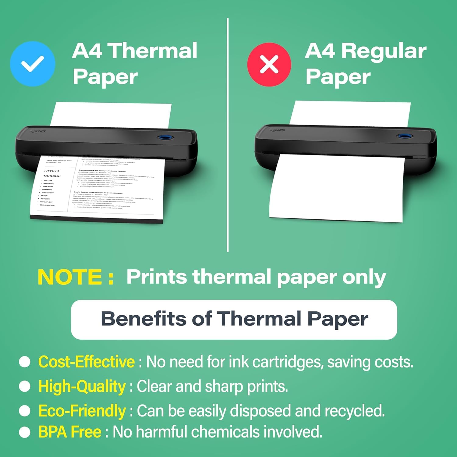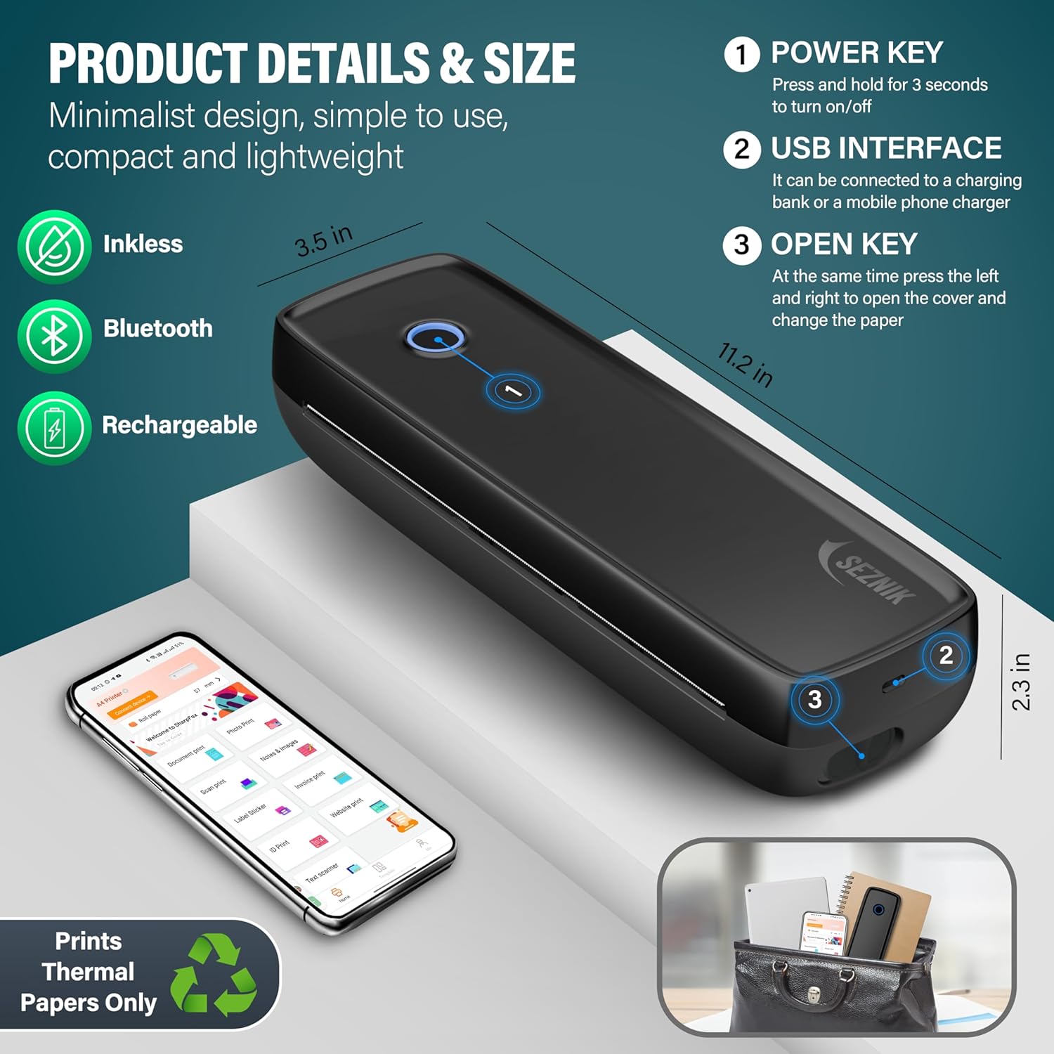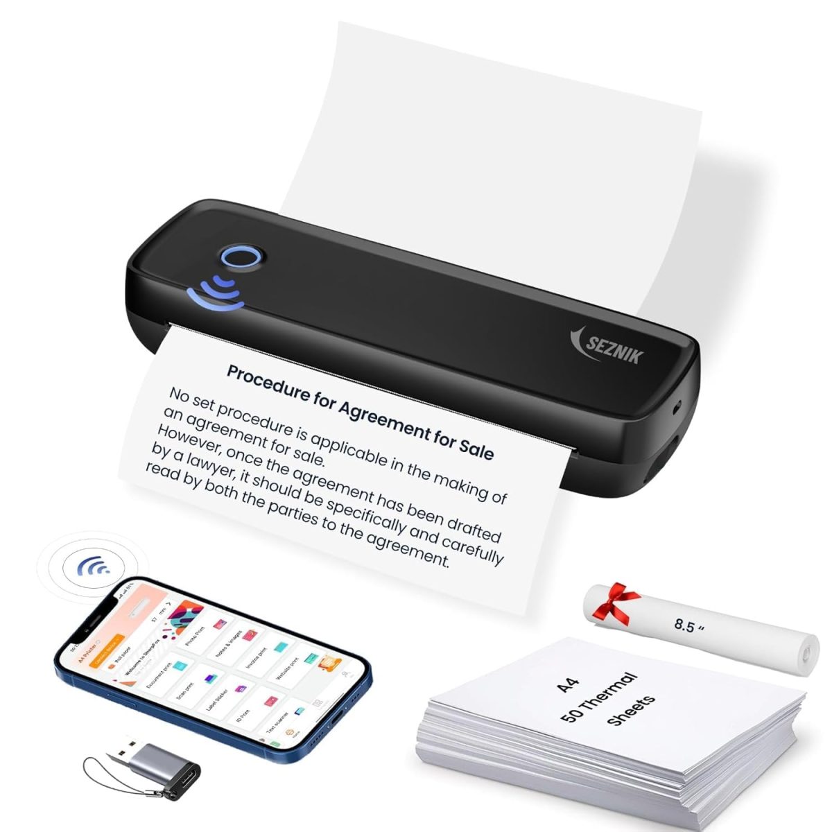 𝐏𝐎𝐑𝐓𝐀𝐁𝐋𝐄 𝐀𝐍𝐃 𝐂𝐎𝐌𝐏𝐀𝐂𝐓, 𝐋𝐈𝐆𝐇𝐓𝐖𝐄𝐈𝐆𝐇𝐓 𝐃𝐄𝐒𝐈𝐆𝐍, 𝐔𝐋𝐓𝐑𝐀 𝐇𝐃 𝟑𝟎𝟒 𝐃𝐏𝐈 𝐂𝐋𝐄𝐀𝐑 𝐏𝐑𝐈𝐍𝐓: [Dimension: 3.5*11.*2.3 inch, Weight:0.8 KG] Take your printing on the go with this lightweight and compact A4-sized printer, perfect for professionals, students, travellers and families. Our a4 printer for printing easily fits in your bag for printing convenience wherever you are. 𝐈𝐍𝐊𝐋𝐄𝐒𝐒 𝐓𝐇𝐄𝐑𝐌𝐀𝐋 𝐏𝐑𝐈𝐍𝐓𝐈𝐍𝐆, 𝐄𝐂𝐎-𝐅𝐑𝐈𝐄𝐍𝐃𝐋𝐘 𝐀𝐍𝐃 𝐂𝐎𝐒𝐓-𝐒𝐀𝐕𝐈𝐍𝐆: Enjoy hassle-free printing without the need for ink cartridges, using advanced thermal printing technology of inkless printer a4 size. Save on costs with this eco-friendly portable printer. 𝐖𝐈𝐑𝐄𝐋𝐄𝐒𝐒 𝐂𝐎𝐍𝐍𝐄𝐂𝐓𝐈𝐕𝐈𝐓𝐘, 𝐁𝐔𝐈𝐋𝐓-𝐈𝐍 𝐏𝐀𝐏𝐄𝐑 𝐑𝐎𝐋𝐋 𝐁𝐎𝐗 & 𝐓𝐖𝐎 𝐌𝐄𝐓𝐇𝐎𝐃𝐒 𝐎𝐅 𝐏𝐀𝐏𝐄𝐑 𝐋𝐎𝐀𝐃𝐈𝐍𝐆: Our mini printer colour print a4 size effortlessly connects to Android, iOS, Windows, and Mac OS devices via Bluetooth, providing seamless mobile printing. Also Connect to laptops, desktops, and mobile devices via USB, ensuring flexibility in usage. Save space with the built-in box for paper rolls, ensuring a tidy and organised workspace. Choose between folding paper and roll paper, providing flexibility for various printing needs. 𝐓𝐘𝐏𝐄 𝐂 𝐂𝐇𝐀𝐑𝐆𝐈𝐍𝐆 𝐀𝐍𝐃 𝐋𝐎𝐍𝐆 𝐁𝐀𝐓𝐓𝐄𝐑𝐘 𝐋𝐈𝐅𝐄: Conveniently charge your printer with Type C cable and enjoy extended printing sessions with the powerful 2600 mAh battery of mini portable printer a4 size. Full recharge takes upto 1.5 hours and it lasts upto 300 sheets print. 𝐐𝐔𝐈𝐂𝐊 𝟐-𝐌𝐈𝐍𝐔𝐓𝐄 𝐒𝐄𝐓𝐔𝐏 & 𝐀𝐔𝐓𝐎𝐌𝐀𝐓𝐈𝐂 𝐏𝐀𝐆𝐈𝐍𝐆 𝐀𝐍𝐃 𝐌𝐔𝐋𝐓𝐈𝐏𝐋𝐄 𝐏𝐀𝐏𝐄𝐑 𝐏𝐑𝐈𝐍𝐓𝐈𝐍𝐆: Get started in minutes with a straightforward setup process. Enjoy a Noise-Free printing experience, perfect for quiet places like offices, libraries, or shared spaces. Efficiently print multiple Size pages (A4, A5, Legal, US Letter, 2 inch, 3 inch, 4 inch) with automatic paging, offering a convenient and time-saving feature. 𝐌𝐔𝐋𝐓𝐈𝐏𝐋𝐄 𝐏𝐑𝐈𝐍𝐓𝐈𝐍𝐆 𝐎𝐏𝐓𝐈𝐎𝐍𝐒: SEZNIK Portable Inkless A4 Thermal Printer supports a variety of thermal printing applications, including maps, documents, memos, lists, photos, and even specialized thermal tattoo paper. Ideal for versatile use, this compact printer is perfect for travel, office, home, car, college, and tattoo studios and also makes a thoughtful Diwali gift.