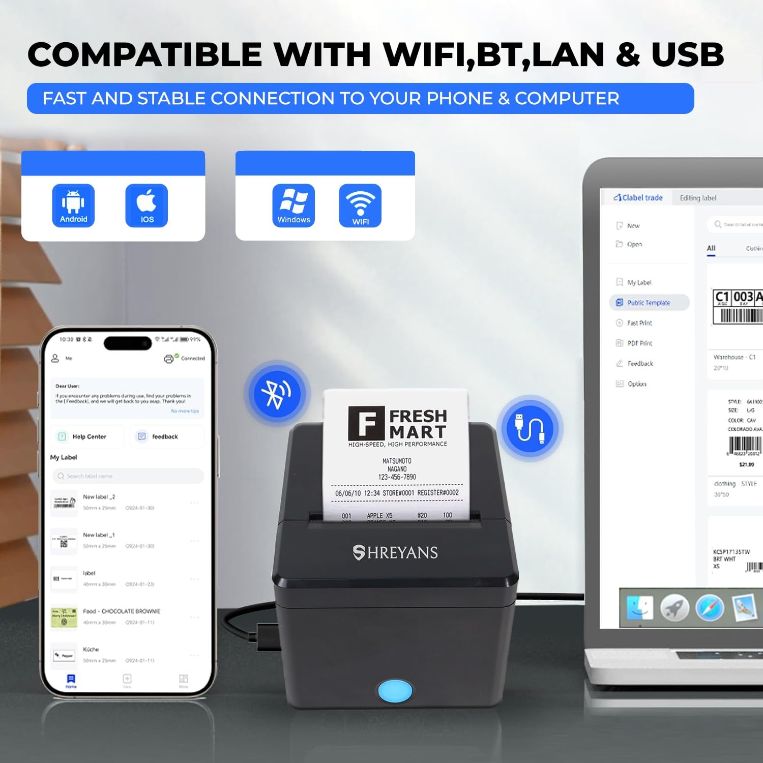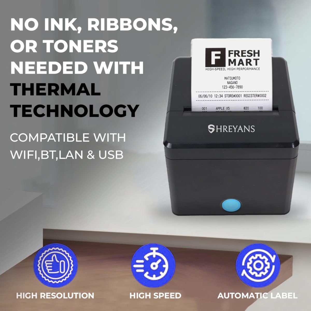 SHREYANS 80mm Thermal Billing Printer with Autocutter | Ultra Fast Speed with Compact Design Makes is Much Easier to use | Bluetooth+WiFi+LAN+USB