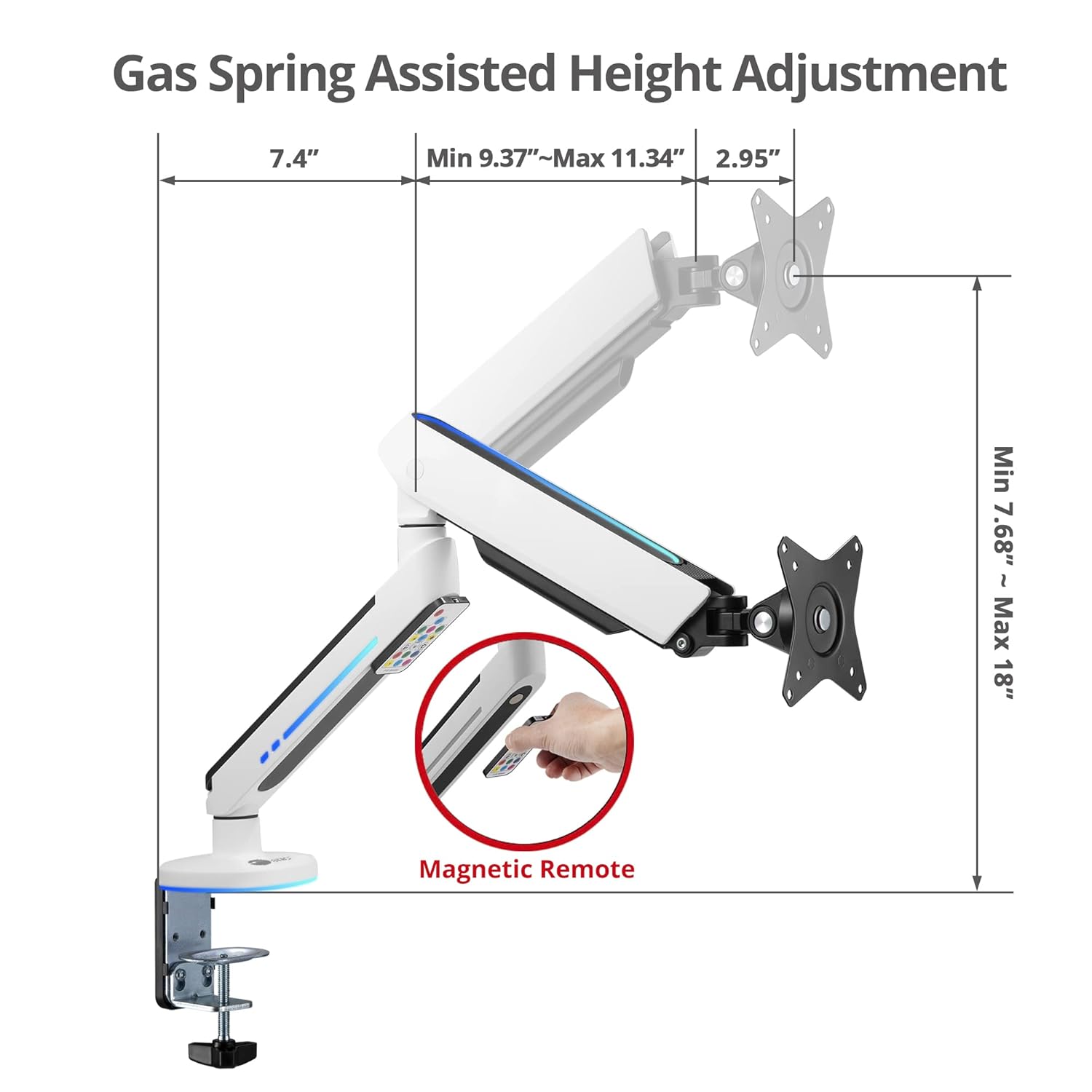 If you are looking to accentuate your gaming space with vibrant lighting effects, unique gaming design, and premium product quality, SIIG’s CE-MT3J11 single monitor mount will not let you down. This premium single-monitor arm gas spring desk mount comes with a built-in gaming RGB lighting system, offering different light themes up to 179 modes and other levels options, such as speed and brightness. The full-motion design supports height adjustment up to 23″, and every joint in the arm is free to move. There are two mounting options, C-clamp and grommet mount bases. Parts are included in the package for easy and quick installation. A detachable and Rotatable VESA plate is also included to support easy monitor installation and to allow portrait/ landscape viewing orientation. The integrated cable management system lets you keep your cables neat, organized, and out of the way for a clean, uncluttered desktop.