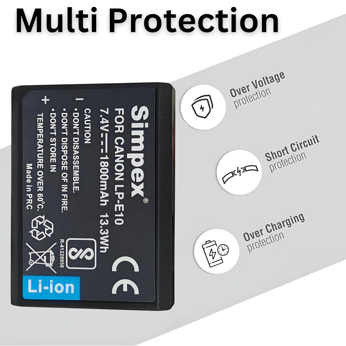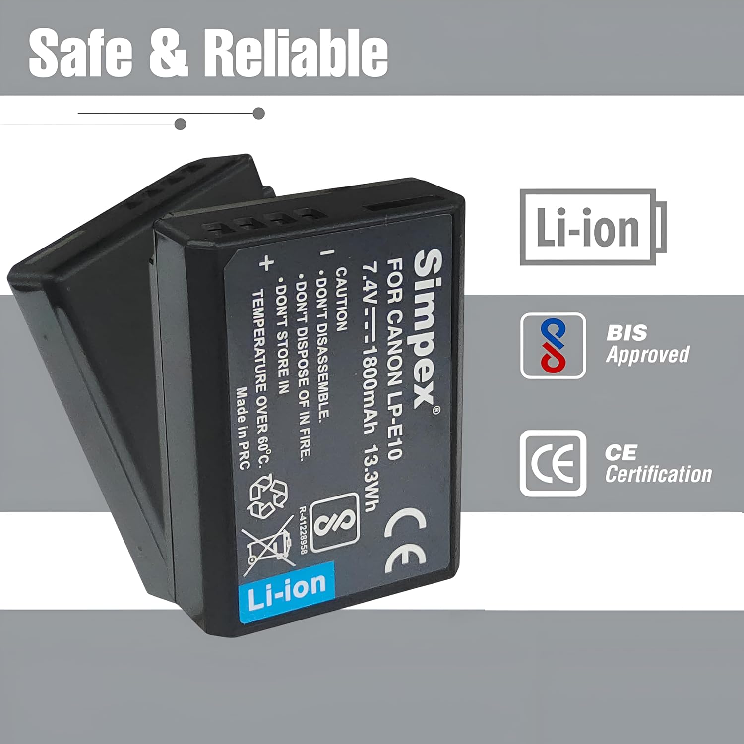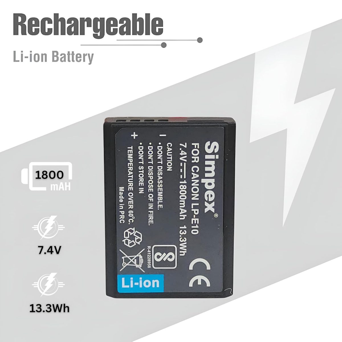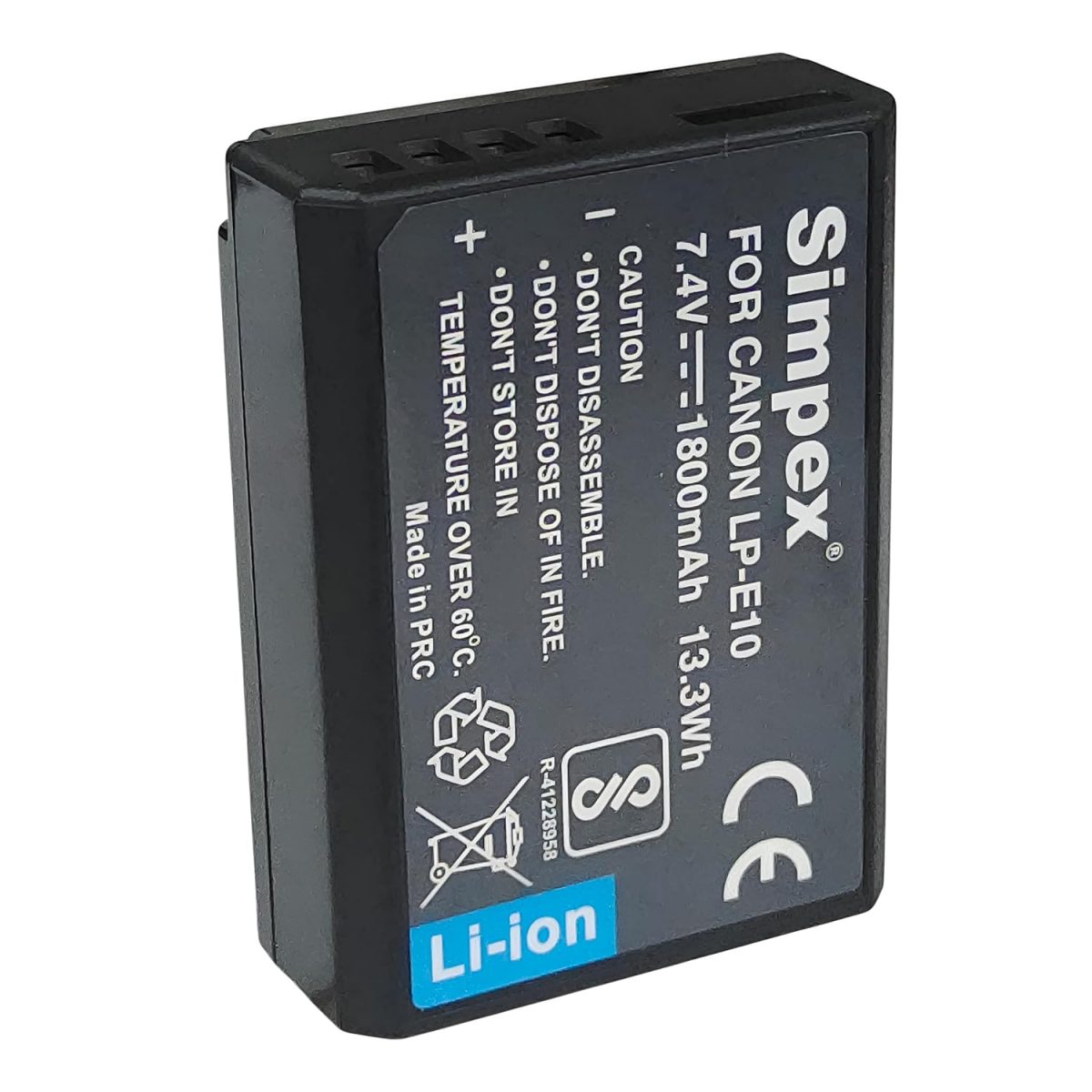 SIMPEXS LP E10 Lithium Ion Rechargable Camera Battery for Canon EOS 1100D, 1200D, 1300D 1500D, 3000D, Rebel T3-T6, Kiss X50-X80, with USB-C Input, Multi-Protection (1800mAh)