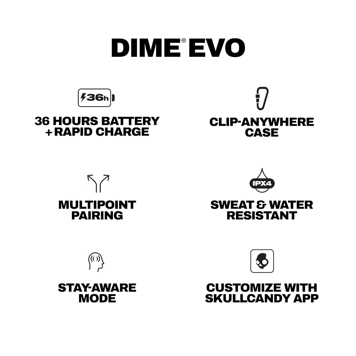 Skullcandy Dime Evo Wireless in Ear Earbuds – 36Hr Battery, Rapid Charge, Multipoint Pairing, Auto Connect, Stay-Aware Mode, Preset EQ Modes (Music/Bass/Podcast) – Black