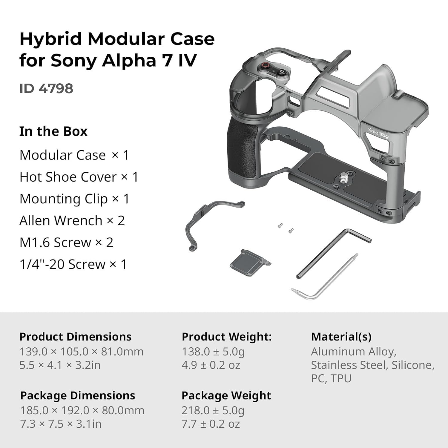 SmallRig Hybrid Modular Cage for Sony Alpha 7 IV 4798 SmallRig Hybrid Modular Cage for Sony Alpha 7 IV 4798 is engineered to provide comprehensive protection and swift tripod mounting. This cage safeguards your Sony Alpha 7 IV with precision-molded coverage that shields edges while maintaining full camera access. The interior features shock-absorbing silicone / TPU pads to prevent scratches. The lightweight modular construction weighs 1/3 less than ordinary cages, enhancing both portability and durability. An ergonomic leather-wrapped handle offers superior comfort, while the integrated Arca-Swiss plate enables quick mounting on Arca-type tripods. The bottom strap slot allows for the attachment of wrist straps (ID 3848) or shoulder straps (ID PSC2428). Work With Sony Alpha 7 IV Packing List Modular Case x 1 Hot Shoe Cover x 1 Mounting Adapter x 1 Allen Wrench x 1 Guarantee Card x 1 Technical Data Product Dimensions: 139.0 x 105.0 x 81.0mm / 5.5 x 4.1 x 3.2in Package Dimensions: 185.0 x 192.0 x 80.0mm / 7.3 x 7.5 x 3.1in Product Weight: 138.0 ± 5.0g / 4.9 ± 0.2 oz Package Weight: 218.0 ± 5.0g / 7.7 ± 0.2 oz Material(s): Aluminum Alloy, Stainless Steel, Silicone, PC, TPU