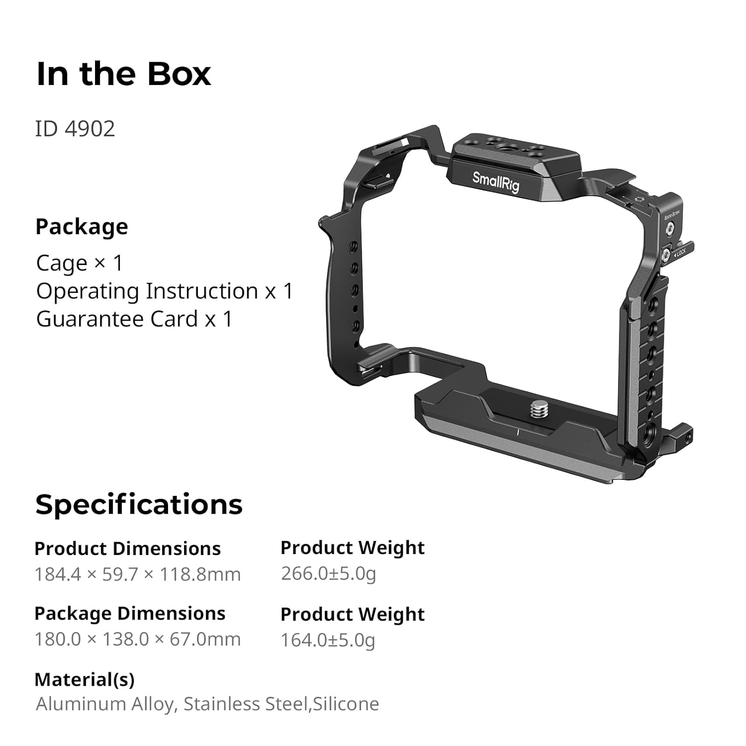 SmallRig Cage for Panasonic LUMIX S1 II / S1 IIE / S1R II / S5 II / S5 IIX / G9 II 4902 SmallRig Cage for Panasonic LUMIX S1 II / S1 IIE / S1R II / S5 II / S5 IIX / G9 II 4902 is designed to attach accessories and protect the camera. It locks the camera via one bottom 1/4″-20 screw and two side lock adapters, with rubber pads preventing scratches. Among its accessory mounting points, 1/4″-20 holes and ARRI 3/8″-16 locating holes support Top Handle 2165C, Side Handle HSN2093C, etc. for easy camera movement and more stability; and the top ARRI 3/8″-16 locating hole fits Monitor Mount 2903B. It also comes with two cold shoe mounts to attach the microphone, an LED video light; a top NATO rail for Top Handle 4483; a left NATO rail for Side Handle 4485; and a bottom QD socket to install a QD shoulder strap. At the bottom, there is an Arca-Swiss quick-release plate, suitable for DJI RS 2/ RSC 2 / RS 3 / RS 3 Pro / RS 4 / RS 4 Pro gimbals and Arca-Swiss tripods, as well as a threaded hole for Arca-Swiss Quick Release Plate 3154. The item also features strap holes on both sides and the bottom, which are compatible with Hand Strap 3848, Shoulder Strap PSC2428, etc. Besides, a magnetic wrench is included for easy disassembly and assembly.