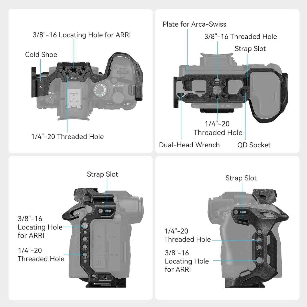 SmallRig “Black Mamba” Camera Cage for Canon EOS R6 Mark II 4161 SmallRig “Black Mamba” Camera Cage for Canon EOS R6 Mark II 4161 is designed to protect the camera and attach accessories. It locks Canon EOS R6 Mark II via one bottom 1/4″-20 screw and two side lock adapters, with rubber pads preventing scratches. Featuring a “Black Mamba” design, this cage has full access to all camera buttons and multiple accessory mounting options. Among them, ARRI 3/8″-16 locating hole supports Top Handle 3765 / 2165C and Monitor Mount 2903B; 1/4″-20 threaded holes fit with Side Handle 4016; the built-in cold shoe mount holds microphone, LED video light; and shoulder & wrist strap holes work with Hand Strap 3848 or Shoulder Strap PSC2428. There is an integrated Arca-Swiss quick-release plate on the bottom for DJI RS 2 / RSC 2 / RS 3 / RS 3 Pro gimbals or Arca-type tripods for a quick switch between handheld, gimbal, and tripod mode as well as a QD mount for a quick-release shoulder strap buckle. Also, a double-ended screwdriver is included for easy assembly and disassembly.
