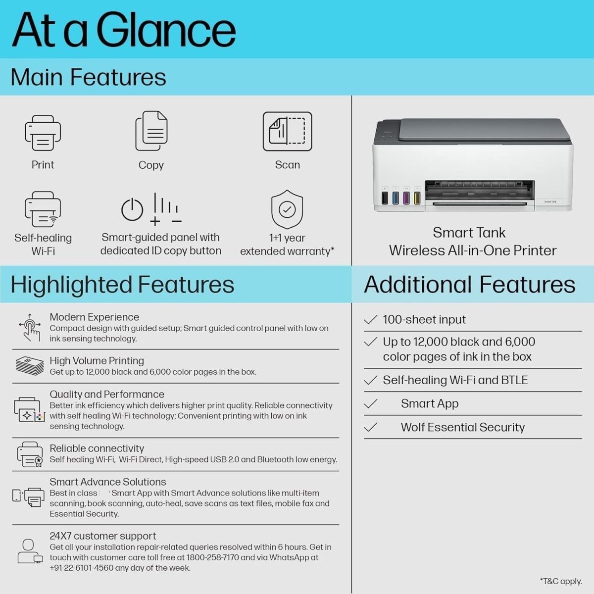 Inktank Printer | Functionality: Printer, Scanner, Copier with dedicated ID Copy button | Print output: Colour and Monochrome | Connectivity: Self Healing Wi-Fi, Wi-Fi Direct, Hi-Speed USB 2.0 and Bluetooth Low Energy.