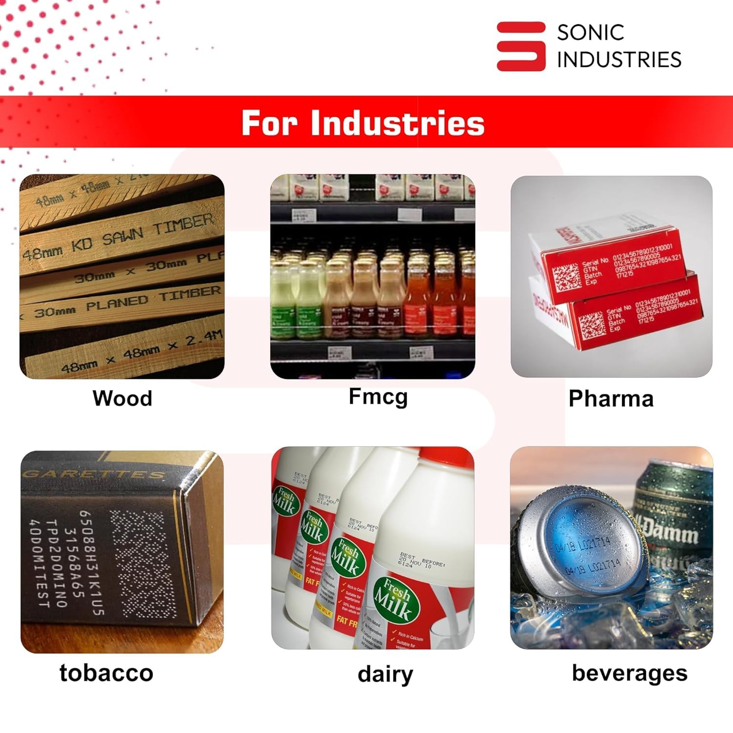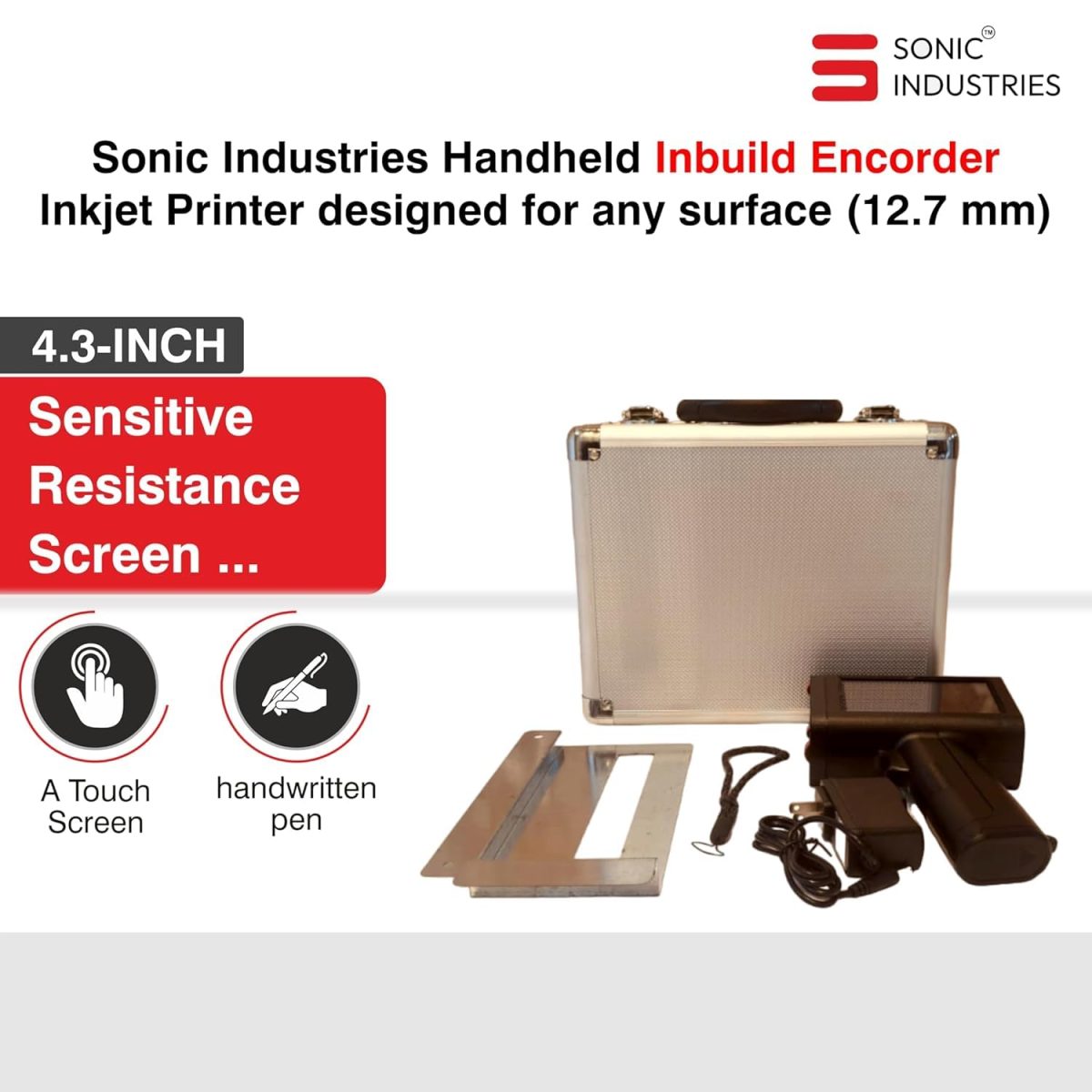 Sonic Industries Handheld Thermal Inkjet Printer For Uneven Surfaces | Built-In Encoders for Precision Anywhere A portable and cost-effective printing solution, this handheld thermal inkjet printer is engineered for precision on curved, rough, or irregular surfaces. Ideal for industrial use, it features built-in encoders for consistent alignment and high-resolution output on materials like plastic, metal, wood, and cardboard. Specifications Print Height: 12.7 mm Resolution: Up to 600 DPI Print Speed: Up to 50 m/min Ink Colors: Black (standard), Red/Blue/Green (custom) Storage: 1,000+ messages Dimensions: 130 x 128 x 242 mm Key Features Built-in encoders for accurate printing on uneven surfaces Supports text, logos, barcodes, QR codes, and serial numbers Lightweight, durable, and easy to operate Thermal inkjet technology for clean, long-lasting prints Compatible with multiple surfaces for industrial versatility