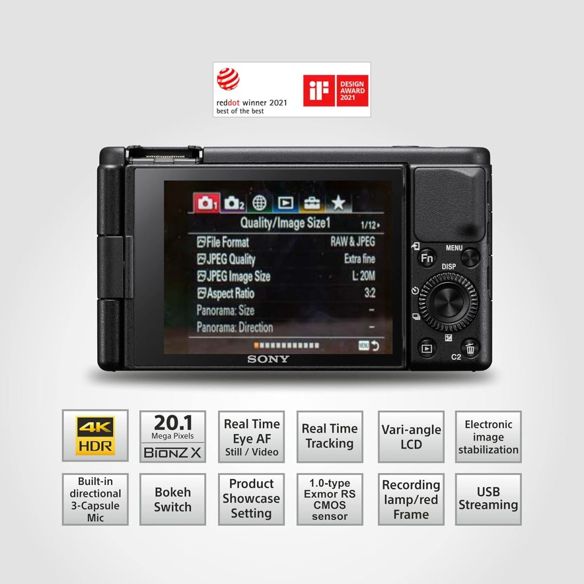 ZV 1 Vlog camera bundled with 1 unit Bluetooth Shooting grip, 1 additional unit Rechargeable battery and 1 unit SD Card.;20.1 MP stacked back illuminated 1 Exmor RS CMOS sensor / DRAM