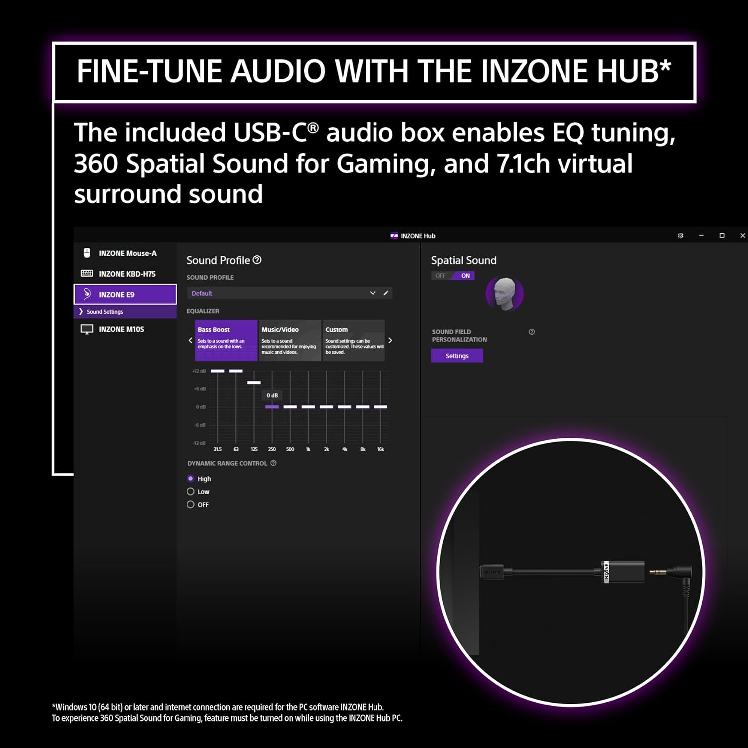 DEVELOPED WITH FNATIC: In collaboration with Fnatic pros, the INZONE E9 gaming earbuds are tuned for FPS games, delivering precise sound and competitive audio performance. FPS-TUNED SOUND BY PROS: Audio tuned by elite players to enhance positional awareness. Hear footsteps and shots with accuracy in fast-paced FPS matches. SECURE, LOW-PROFILE FIT: Low-profile design and flexible ear hook sits snugly for all-day comfort and stability during intense gaming sessions or competitions. CUSTOM FIT WITH FOUR EARTIP SIZES: Includes four ear tip options for a personalized fit that ensures optimal comfort and passive noise isolation. SEALED DESIGN BLOCKS DISTRACTIONS: First Sony sealed body IEMs with isolating tips to keep distractions out and focus in. EQ CONTROL WITH INZONE HUB: Fine-tune EQ settings, game-specific profiles, and more with the INZONE Hub software for PC gaming. USB-C AUDIO BOX INCLUDED: Compact USB-C audio box enables 360 Spatial Sound for gaming and EQ control to total command over your soundstage. SLIM DESIGN FOR EARMUFFS: Thin 1.8m cable and compact profile fits comfortably under earmuffs or headsets, ideal for competitive and professional players. CARRYING CASE FOR EASY ACCESS: Includes a sleek, portable, quick-access case to keep your gear protected and always ready for your next match.