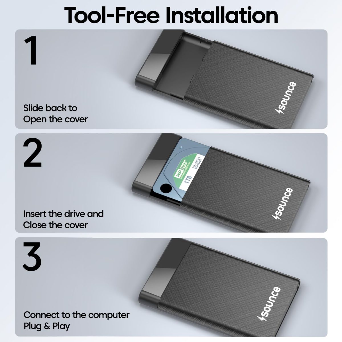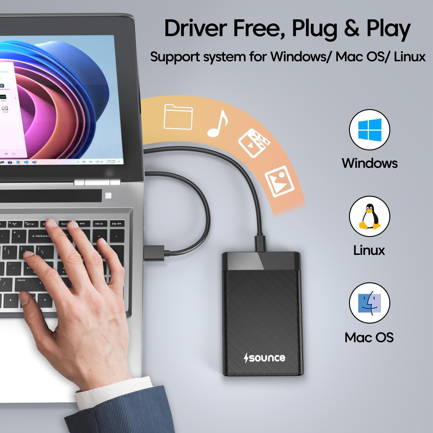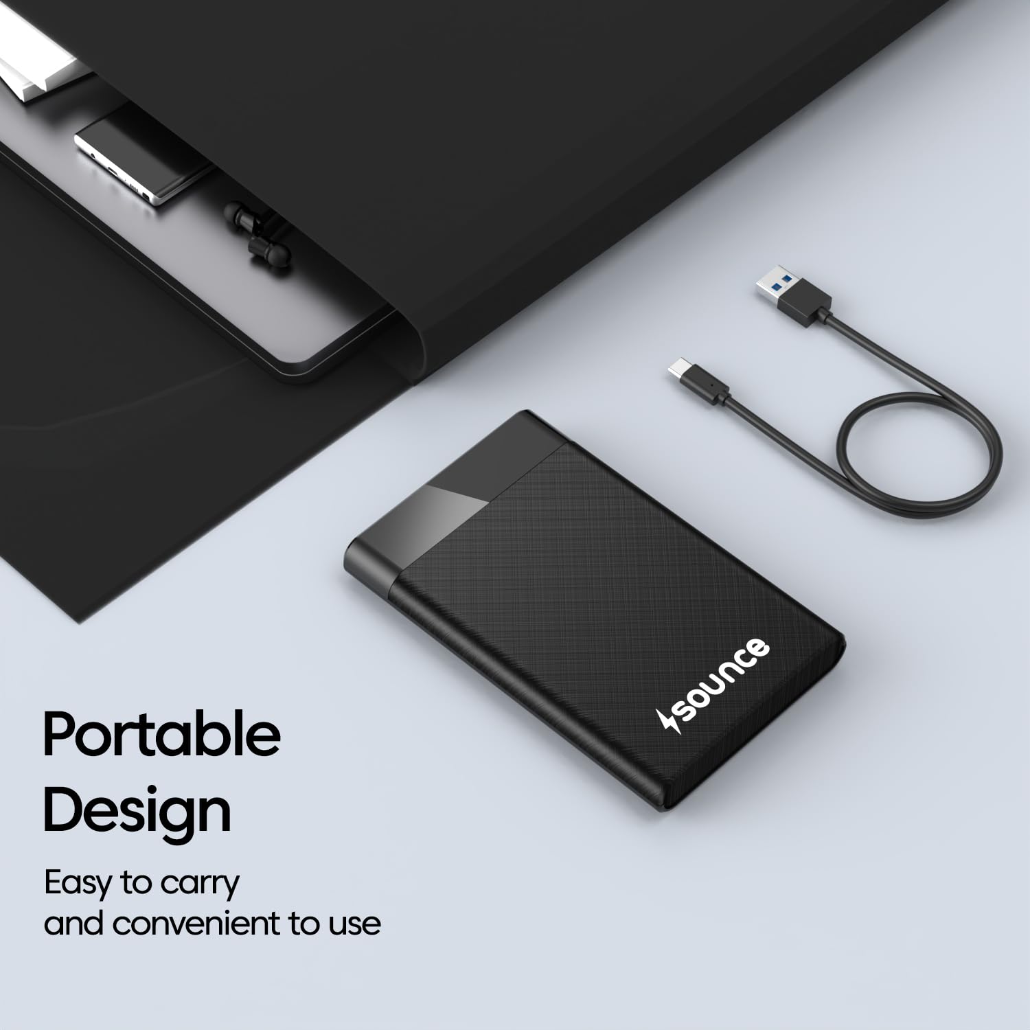 The Sounce 2.5-Inch Hard Drive Enclosure (Black) is a high-speed, versatile external storage solution designed for SATA III SSDs and HDDs, delivering ultra-fast 6Gbps data transfer speeds with UASP acceleration for enhanced performance. Compatible with 7mm and 9.5mm 2.5-inch drives up to 4TB, this enclosure works seamlessly with Windows, macOS, Linux, Xbox, PS4/PS5, Smart TVs, and more, making it ideal for data backups, storage expansion, and file recovery. The tool-free, slide-in installation allows quick and hassle-free setup, while the plug-and-play functionality eliminates the need for additional drivers. Crafted from durable ABS plastic, it offers excellent heat dissipation and built-in protections against over-current, over-voltage, short-circuiting, and overheating, ensuring long-term reliability. The integrated LED indicator provides real-time drive status updates, while the USB-C to USB-A detachable cable ensures easy and flexible connections. Whether you’re reviving old hard drives, creating a bootable disk, or expanding your gaming storage, the Sounce 2.5-Inch HDD/SSD enclosure delivers speed, security, and convenience in one sleek package. ✅【High-Speed 6Gbps Data Transfer with UASP Acceleration】: The Sounce 2.5-inch Hard Drive Enclosure features USB 3.1 Gen 1 and SATA III technology, delivering ultra-fast data transfer speeds up to 6Gbps. With UASP (USB Attached SCSI Protocol) support, it ensures up to 30% faster performance compared to traditional USB 3.0, significantly reducing latency and improving data efficiency when transferring large files, gaming, or streaming media. ✅【Universal Compatibility for 7mm/9.5mm SSDs & HDDs】: This external enclosure is designed to fit 2.5-inch SATA SSDs and HDDs up to 4TB, making it widely compatible with major brands like Western Digital, Toshiba, Samsung, Kingston, Crucial, and Seagate. Whether you’re using it with Windows, Mac, Linux, or connecting to PCs, Laptops, Xbox, PS4/PS5, Smart TVs, or routers, this enclosure provides seamless storage expansion and fast data access. ✅【Tool-Free Installation & Plug-and-Play Convenience】: Enjoy hassle-free setup with a tool-free slide-in design, allowing for quick SSD/HDD installation without the need for screws or tools. The hot-swappable feature ensures easy drive replacement, and the plug-and-play functionality means no additional drivers are required—simply connect the enclosure, and it’s ready to use. ✅【Reliable Protection with Durable ABS Shell & Secure Design】: Crafted from high-quality ABS plastic, the Sounce HDD enclosure offers excellent heat dissipation and a lightweight yet durable build. It is equipped with built-in safeguards, including over-current protection, over-voltage protection, short-circuit prevention, and anti-overheating technology, ensuring safe and stable operation for your valuable data. ✅【Ideal for Data Backup, Storage Expansion & File Recovery】: This portable SATA enclosure is perfect for reviving old hard drives, backing up data, cloning files, and recovering essential files from old PCs. Whether you’re expanding your gaming storage, creating a bootable drive, or using it for high-speed data transfer, the Sounce 2.5-inch HDD/SSD enclosure is a must-have accessory.