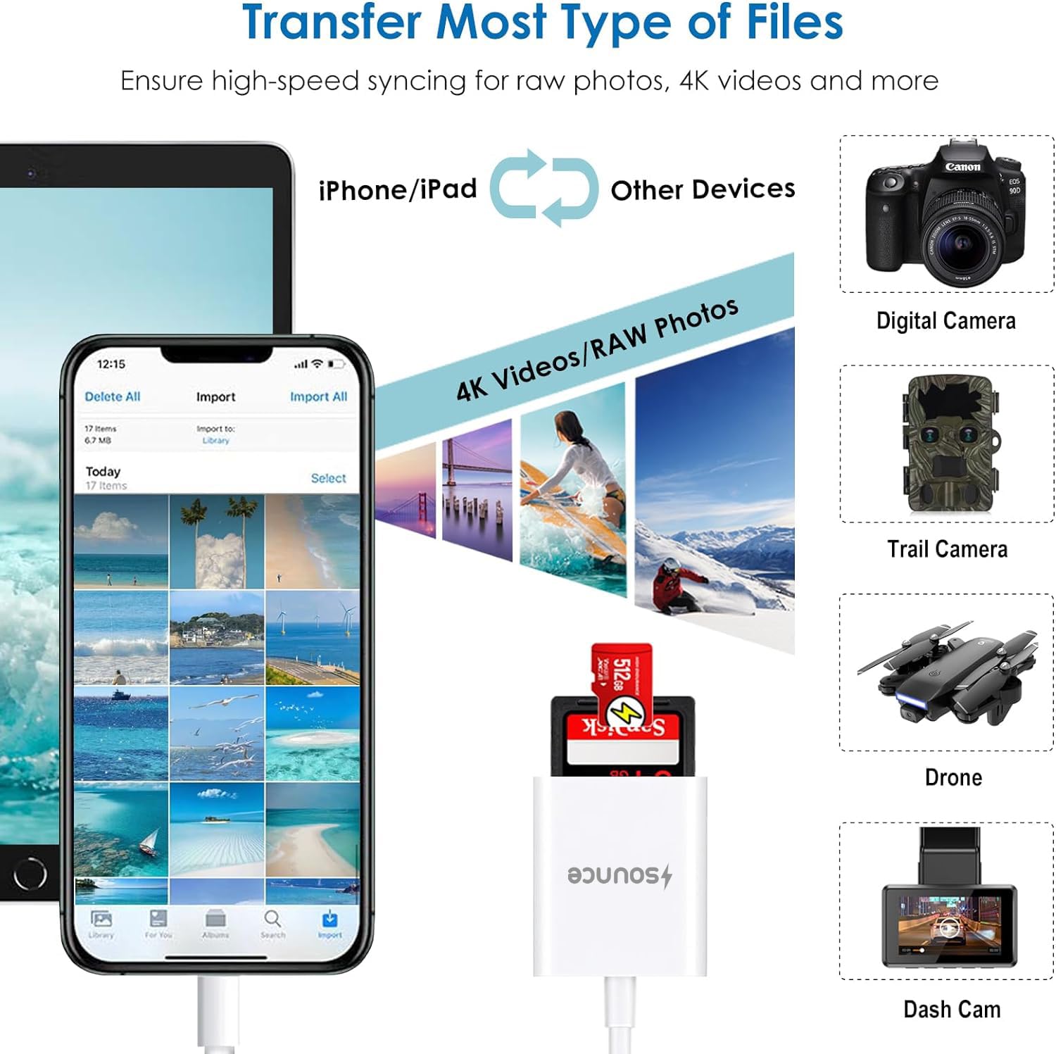【Plug and Play Convenience】: Experience hassle-free setup with the “Plug and Play” functionality of the Sounce 2 in 1 SD TF Card Reader Adapter. Simply connect it to your iPhone or iPad, insert your SD or TF card into the corresponding slot, and start accessing your files. This user-friendly design eliminates the need for additional drivers or complicated configurations.